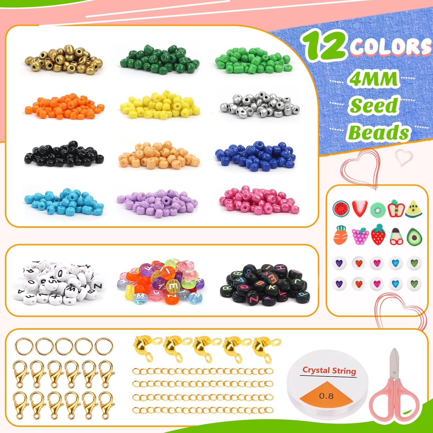 O conjunto inclui 600 contas com letras, 12 cores de contas de vidro, 10 contas de cerâmica em formato de fruta, 10 contas em forma de coração, 30 fechos de bolsa, 10 correntes de extensão, 10 fechos de lagosta, 30 argolas metálicas, além de tesoura e cordão elástico para começar a criar de imediato.