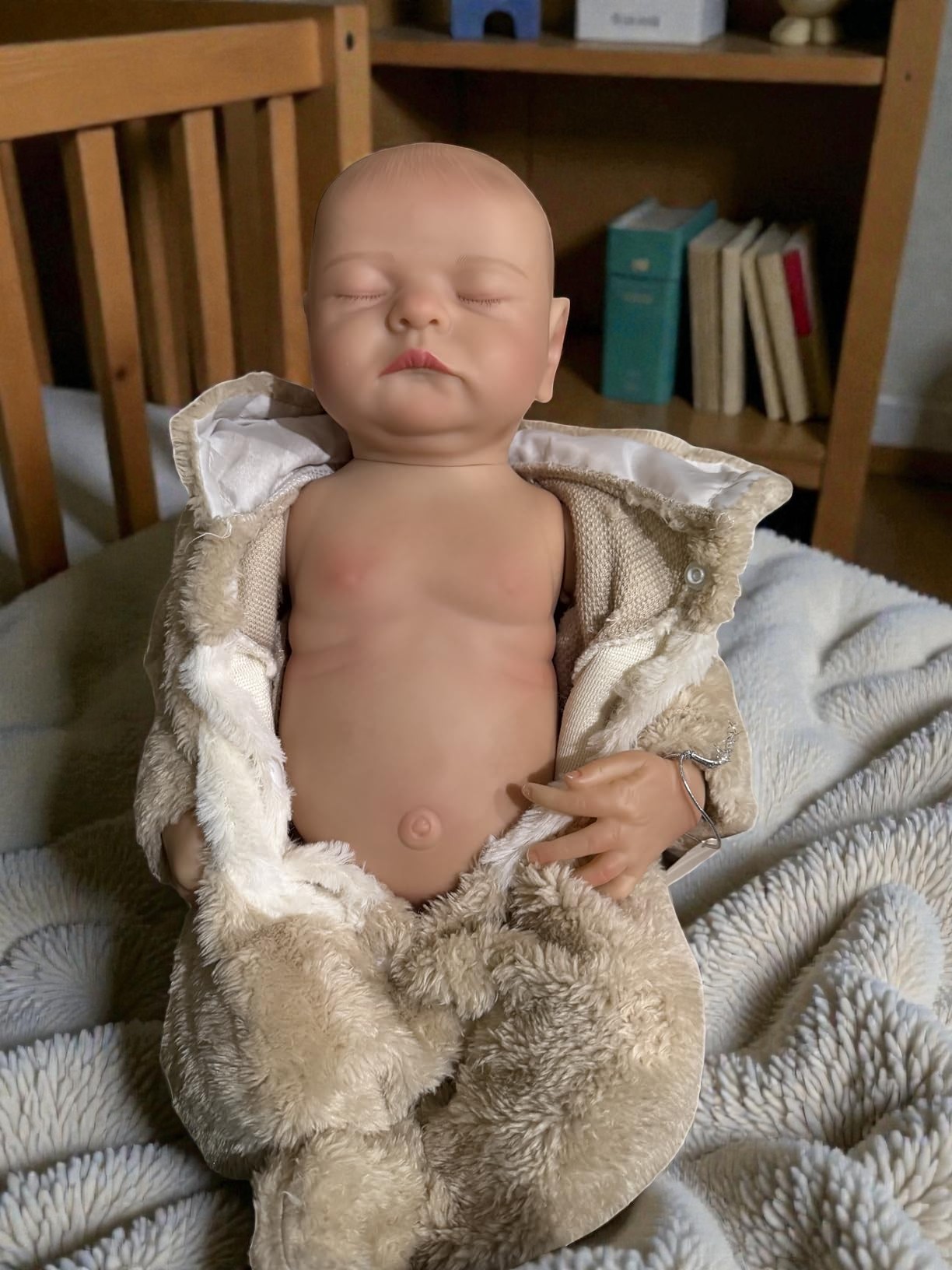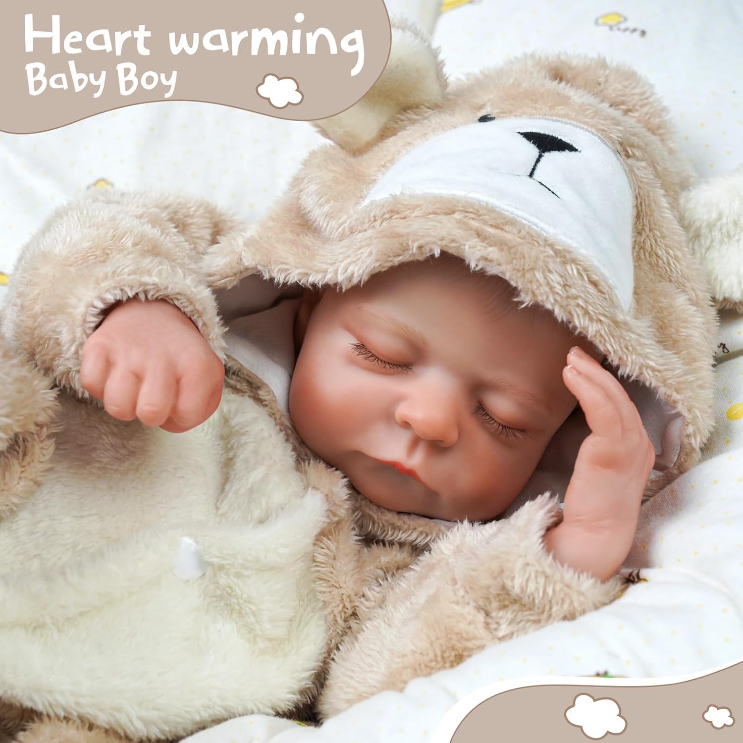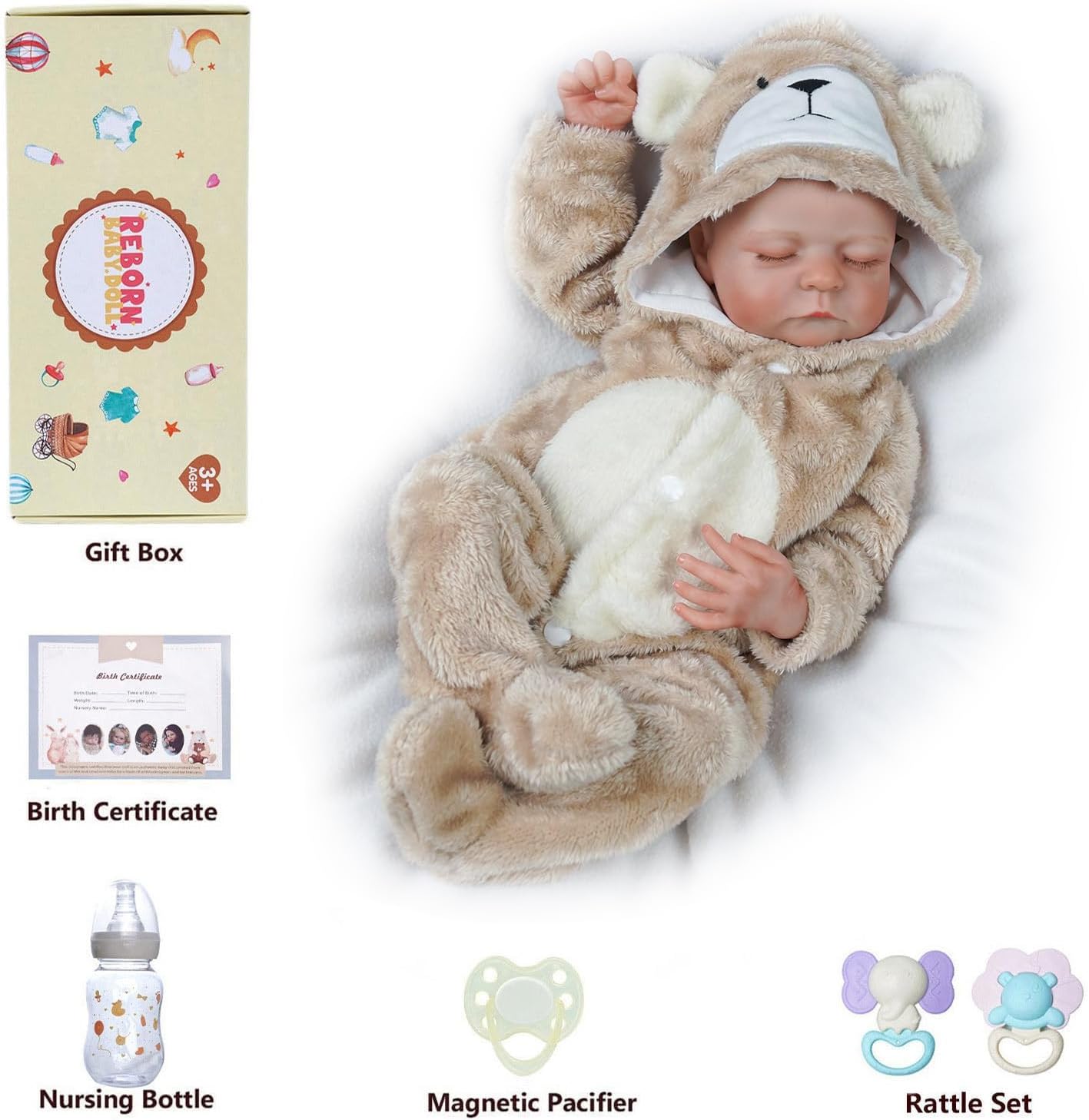 ✺ Lindo bebé recém-nascido com detalhes feitos à mão. Olhos fechados, não abrem. ✺Tamanho realista de um recém-nascido: aproximadamente 47 cm (medição manual) e 1,3kg. Tem um rosto bonito, sobrancelhas pintadas à mão e pestanas coladas à mão. Veste roupas de prematuro ou recém nascido. ✺ Material: corpo inteiro em Silicone Vinílico, pode ser levado ao banho como a um bebé de verdade. ✺ Cabelo: delicadamente pintado a mão. Efeito realista. ✺ Acompanha: a roupa da foto, 1 chupeta magnética, 1 biberão, 2 chocalhos e 1 certidão de nascimento. ✺ Segurança e qualidade: as bonecas cumprem os requisitos de segurança ASTM F963 e EN71 para crianças a partir de 3 anos.