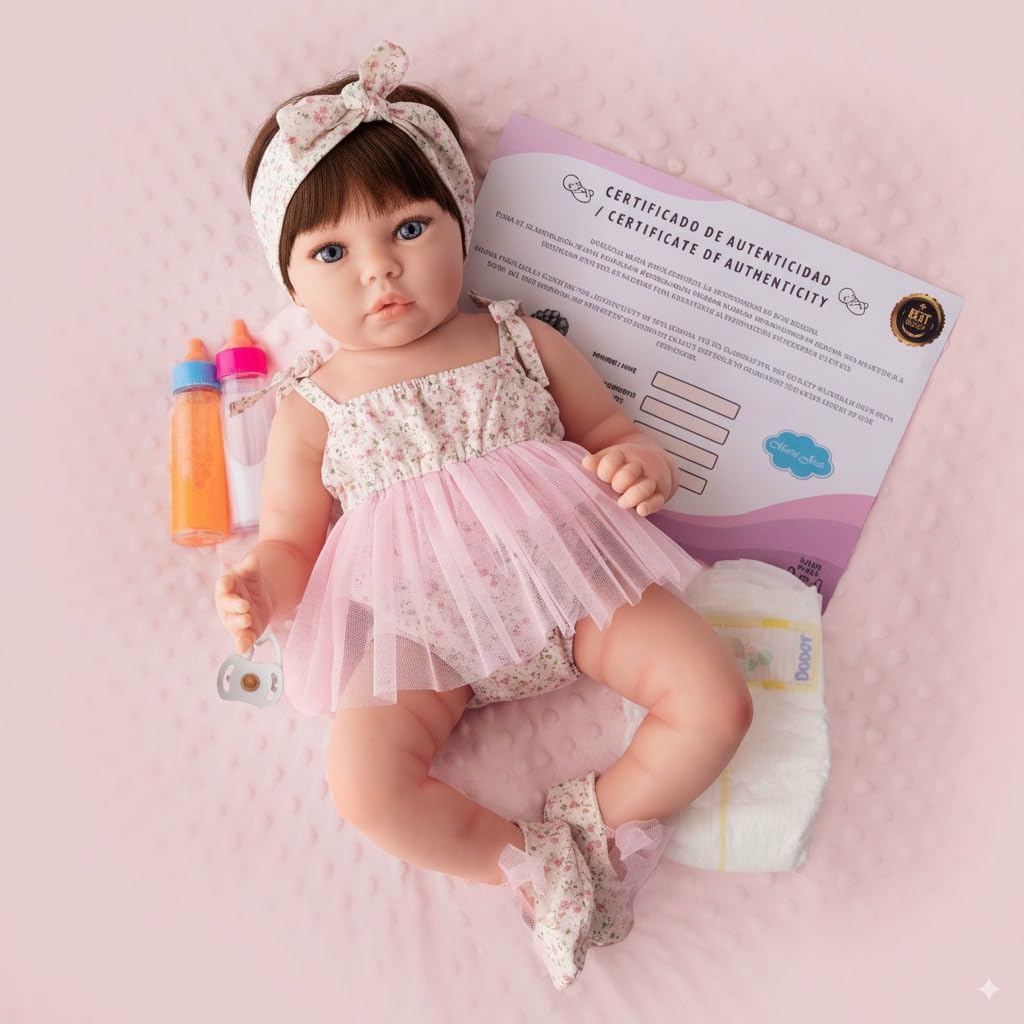 Boneca Bebé Reborn, Aurora, menina, 50cm, 2kg, corpo inteiro em Silicone Vinilico com acessórios, feito a mão, recém nascido