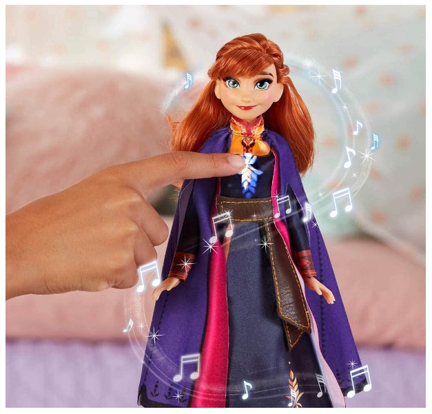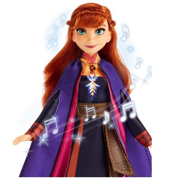 Adorável boneca cantora Anna, a famosa personagem dos filmes do Frozen da Disney, tem o cabelo comprido vermelho solto. Cante músicas de Frozen, pressione o botão do espartilho para ouvir como Anna canta "The Next Right Thing" do filme Frozen 2 da Disney