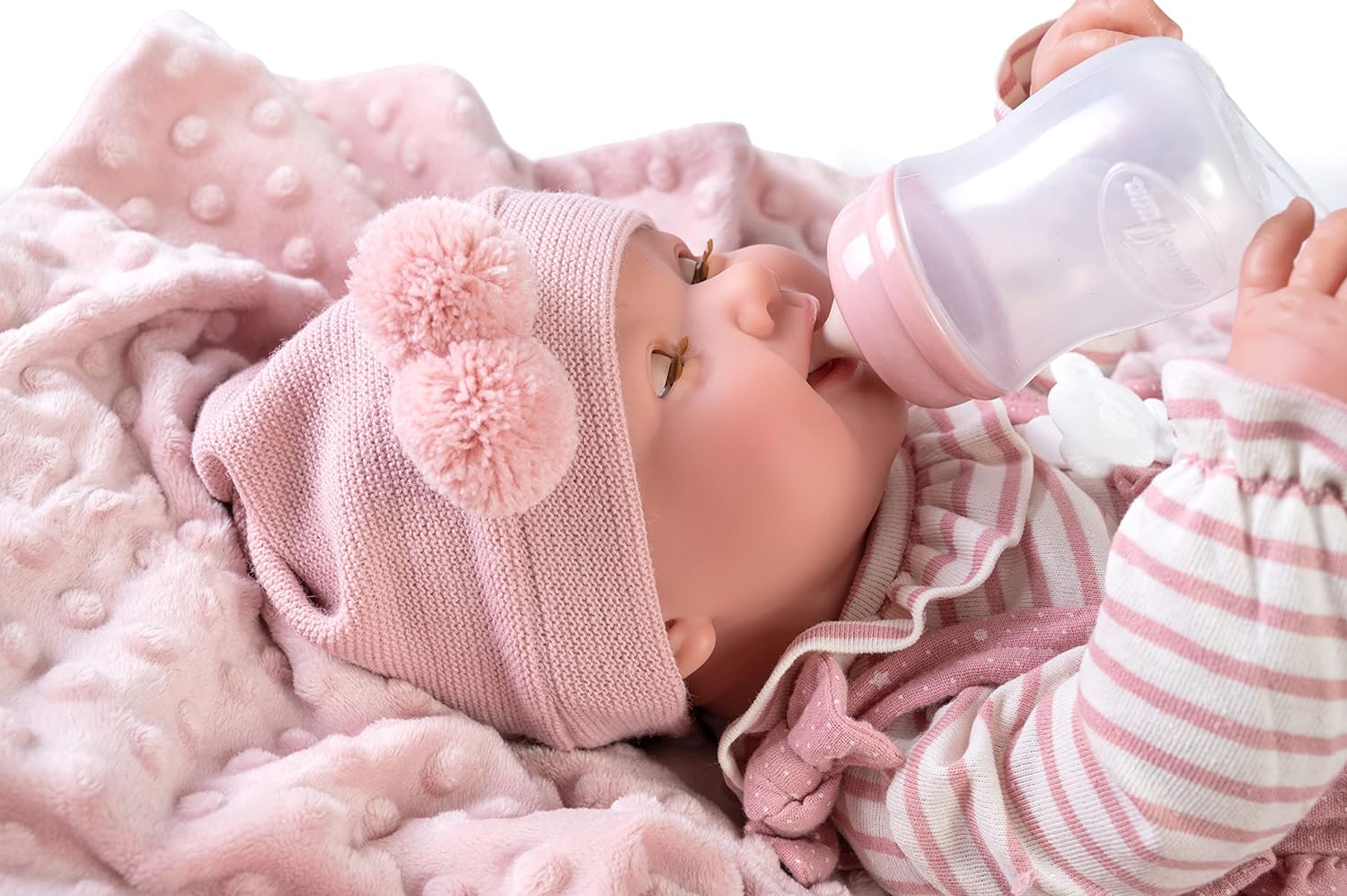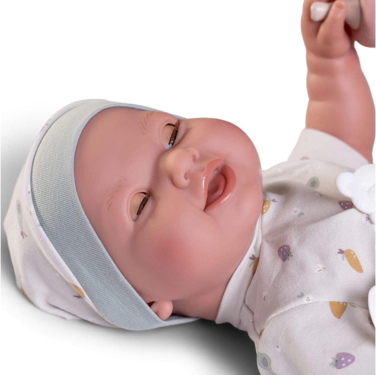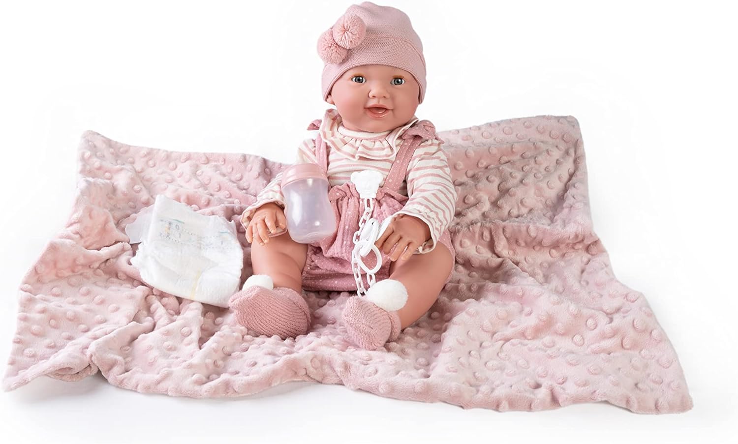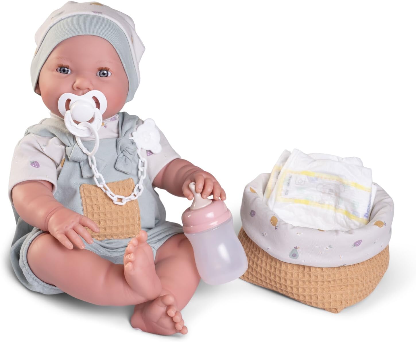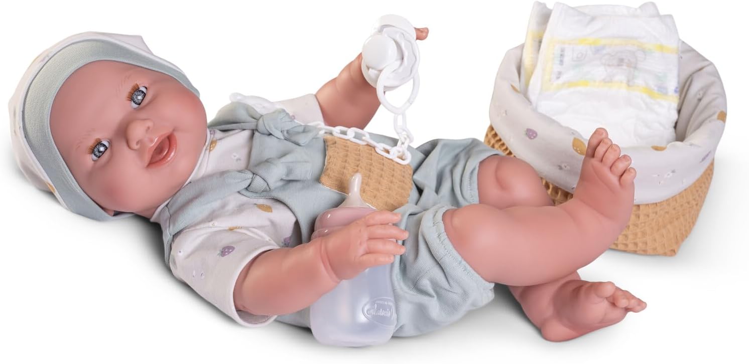 ✺ Linda bebé recém-nascida com detalhes feitos à mão. Olhos abrem e fecham, da-lhe o biberão e ela fará xixi em sua fraldinha. ✺Tamanho realista de um recém-nascido: aproximadamente 42 cm (medição manual) e 1,3kg. Veste roupas de prematuro ou recém nascido. ✺ Material: corpo inteiro em Silicone Vinílico, pode ser levado ao banho como a um bebé de verdade. Corpo anatomicamente correto (possui parte de género). ✺ Acompanha: a roupa da foto, 1 chupeta magnética, 1 biberão, 1 fralda e 1 manta. Na opção de roupa azul, acompanha o cesto no lugar da manta. ✺ Segurança e qualidade: as bonecas cumprem os requisitos de segurança ASTM F963 e EN71 para crianças a partir de 3 anos.