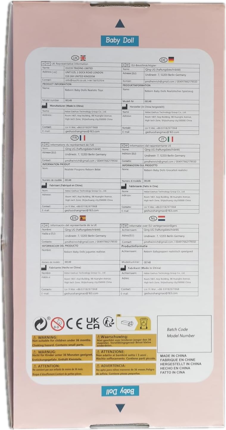 ● Material: Cabeça e 3/4 dos membros do bebésão feitos de vinil/silicone. Corpo em tecido com enchimento interno em algodão PP.
