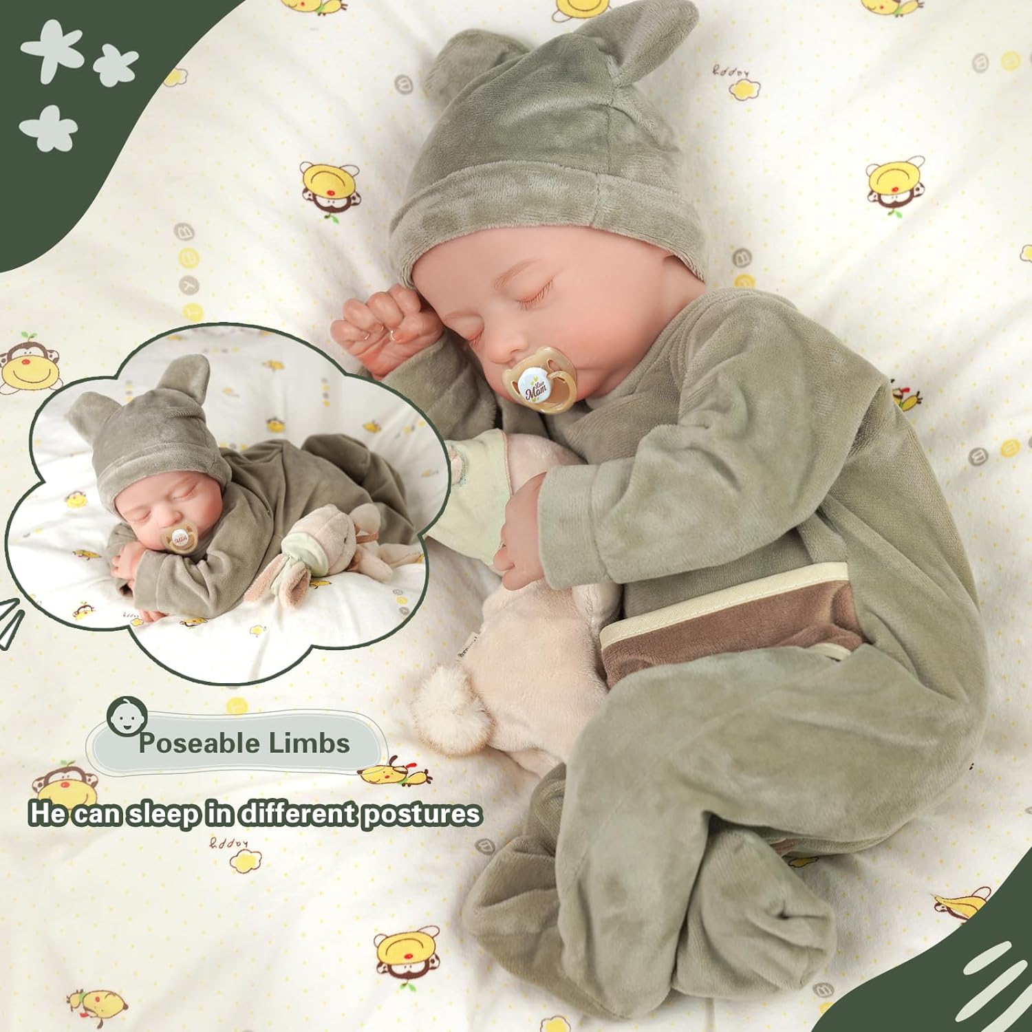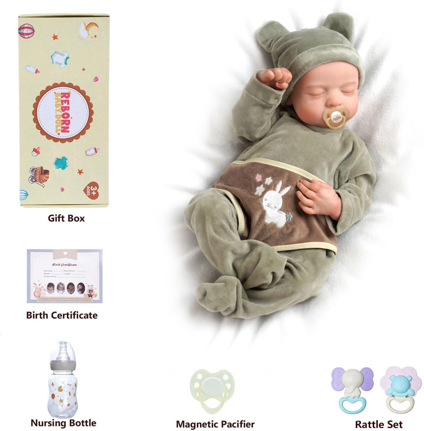✺ Lindo bebé recém-nascido com detalhes feitos à mão. Olhos fechados, não abrem. ✺Tamanho realista de um recém-nascido: aproximadamente 44 a 46 cm (medição manual) e 1,3kg. Tem um rosto bonito, sobrancelhas pintadas à mão e pestanas coladas à mão. Podes vestir a sua bebé com roupas de prematuro ou recém nascido. ✺ Material: corpo inteiro em vinil/silicone, pode ser levado ao banho como a um bebé de verdade. ✺ Cabelo: delicadamente pintado a mão. Efeito realista. ✺ Acompanha: a roupa da foto (cor varia em cinza ou verde), 1 chupeta magnética, 1 biberão, 2 chocalhos e 1 certidão de nascimento e uma caixa presenteável. ✺ Segurança e qualidade: as bonecas cumprem os requisitos de segurança ASTM F963 e EN71 para crianças a partir de 3 anos. Receba em até 3 dias uteis após a compra.