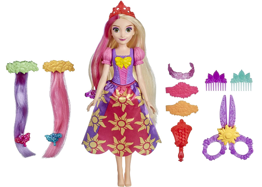 Nova Boneca Rapunzel longos cabelos coloridos, com 10 acessórios, Oficial Hasbro