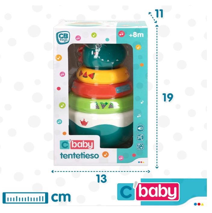 Inclui 5 peças: uma base curva sobre o qual se empilham as diferentes peças para completar o dinossauro (3 anéis coloridos com som e a cabeça do dinossauro)