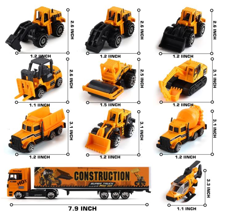 O conjunto de camiões com motor inclui 11 mini veículos Die-Cast em diferentes designs e 8 trabalhadores de construção de estilo único, escavadeiras, trituradores, empilhadores, empilhadores, empilhadores, carregadores de rodas, escavadeiras, camiões tipo basculantes, etc. O veículo de transporte de dupla face permite que as crianças aprendam sobre os diferentes tipos de veículos de construção e desenvolvam habilidades educativas precoce. Ideal para meninos, meninas, aniversários, festas de Natal, presentes. O carro com motor pequeno e a figura do trabalhador são feitos de liga de metal e material plástico ABS de alta qualidade. Atende aos padrões de brinquedos dos EUA. 40-Tamanho perfeito para crianças acima de 3 anos, cabe nas mãos e nos bolsos das crianças. Receba em até 3 dias uteis após a compra.