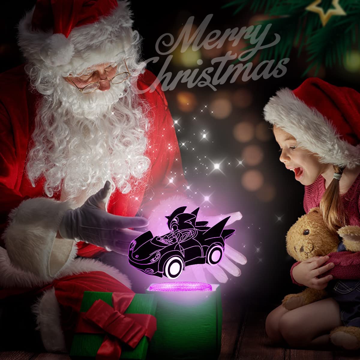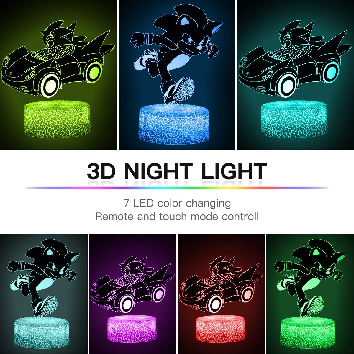 Candeeiro Sonic 3D, com 16 mudanças de cor, 2 figuras: Boneco Sonic + Carro