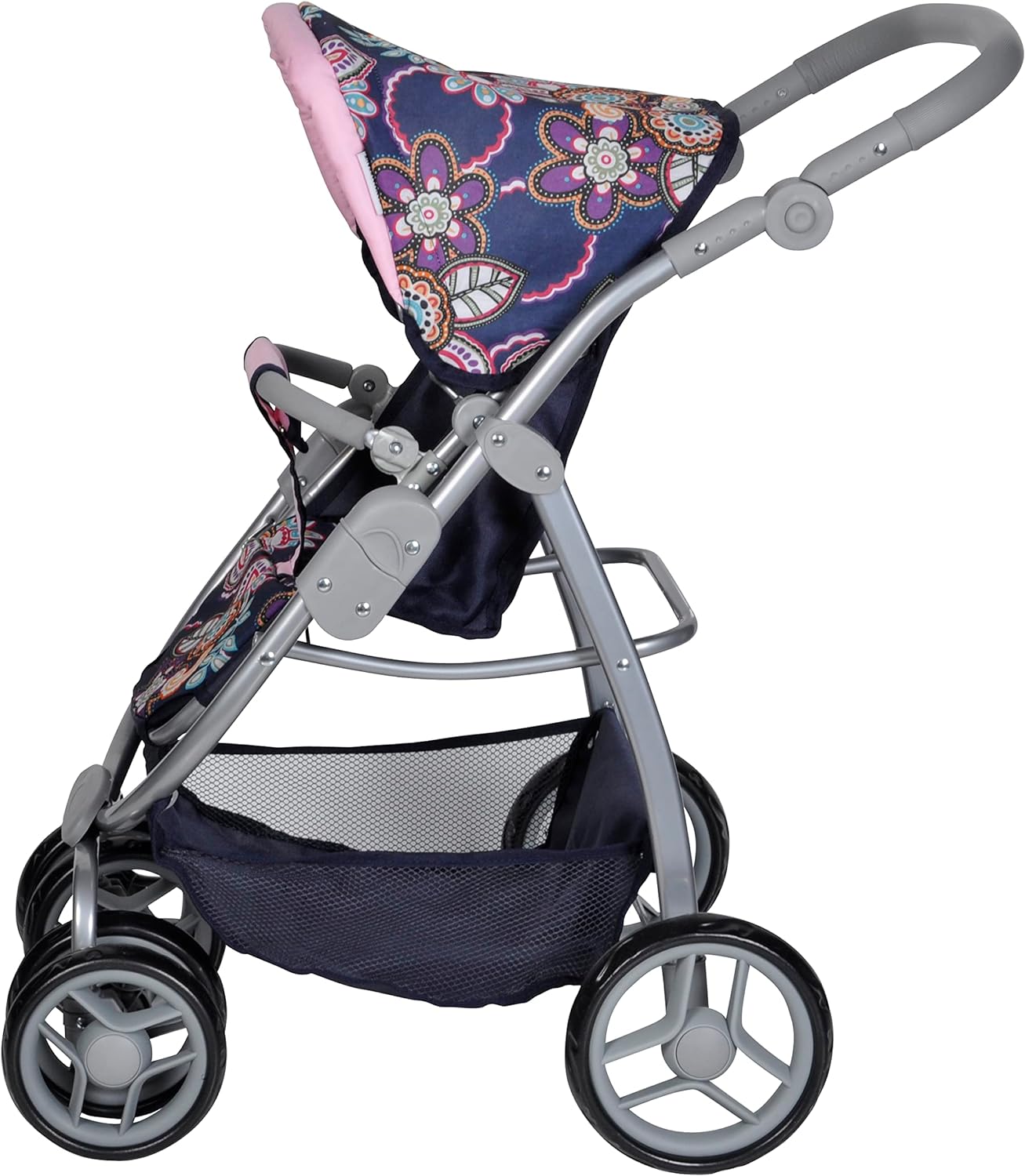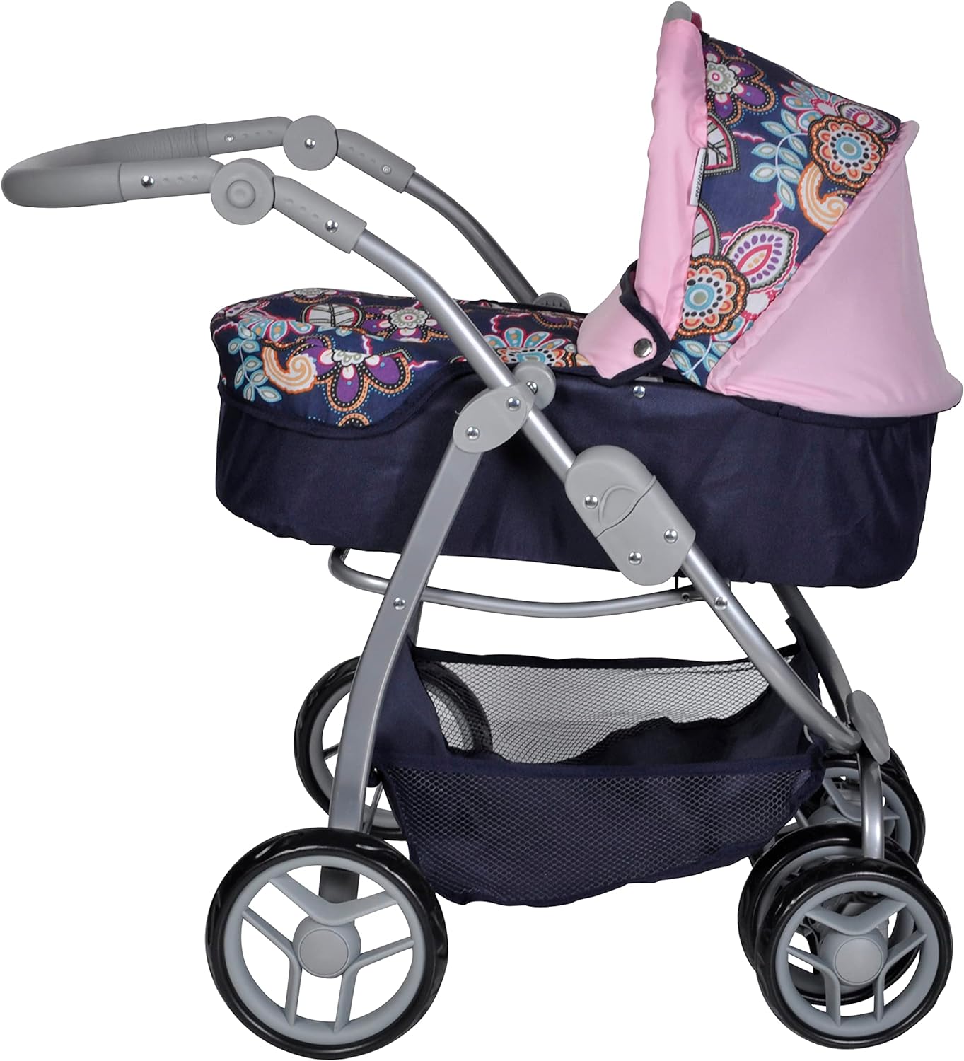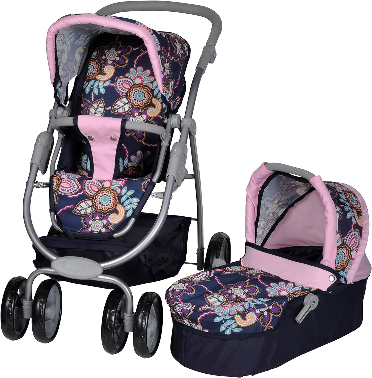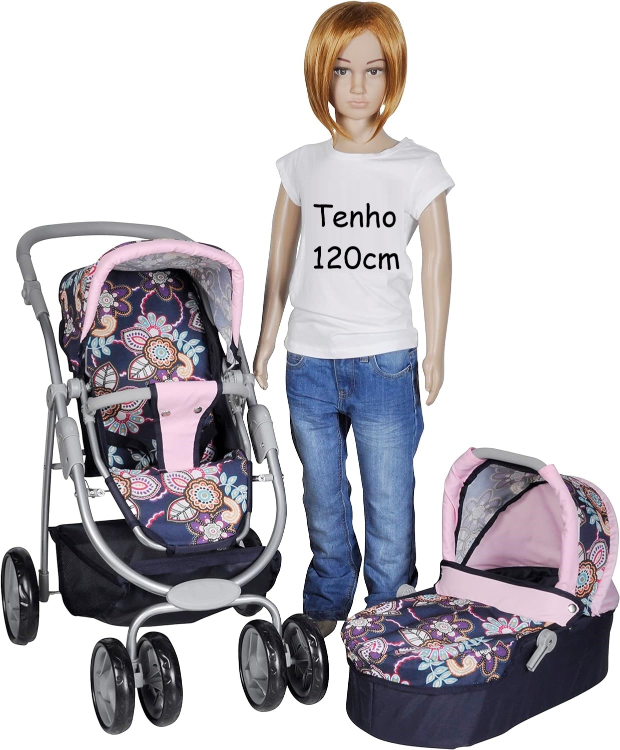 Carrinho para bonecas com altura da pega graduável 11 posições: de 43 a 82 cm. Conversível em carrinho de passeio ou para as bonecas dormirem, cesta de compras incluída. Com rodas dianteiras duplas giratórias. Uma prenda que sem duvidas irá fazer as crianças muito felizes por muitos anos devido a seu design reforçado e resistente.
