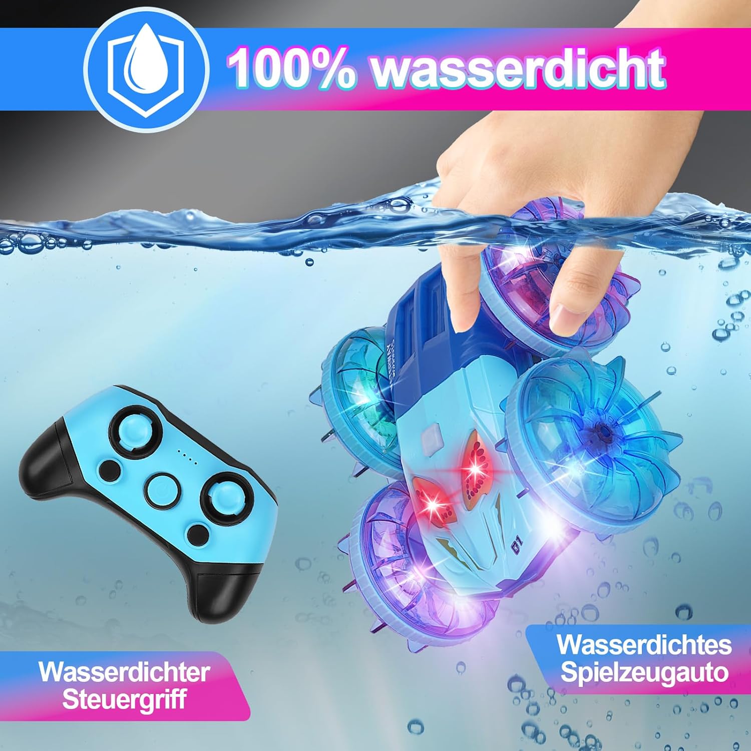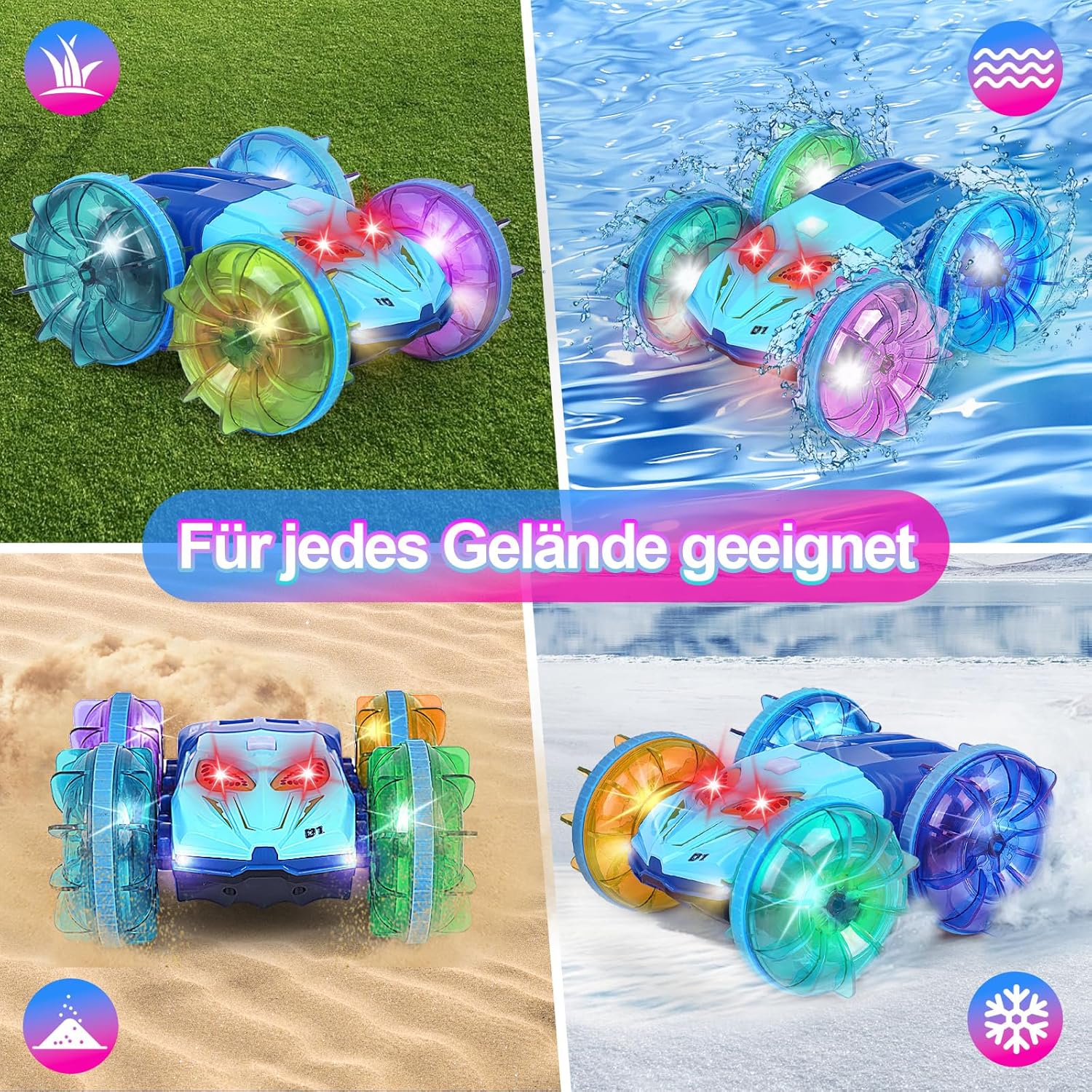 Carro Telecomandado Anfíbio, rotação 360º, 7 mudanças cor luzes LED, anda na agua, baterias recarregáveis,