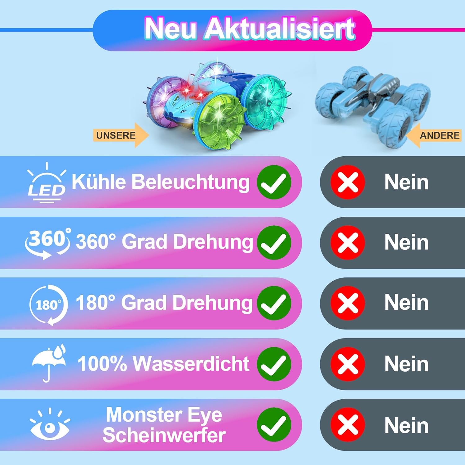 As luzes em forma de olho de monstro do carro estão cheias de tecnologia; as crianças podem controlar a mudança de cor em sete cores, tanto em terra como na água, através do controlo remoto. O seu design de carro desportivo é atraente para as crianças e aumenta a sua diversão, especialmente em condições de pouca luz.