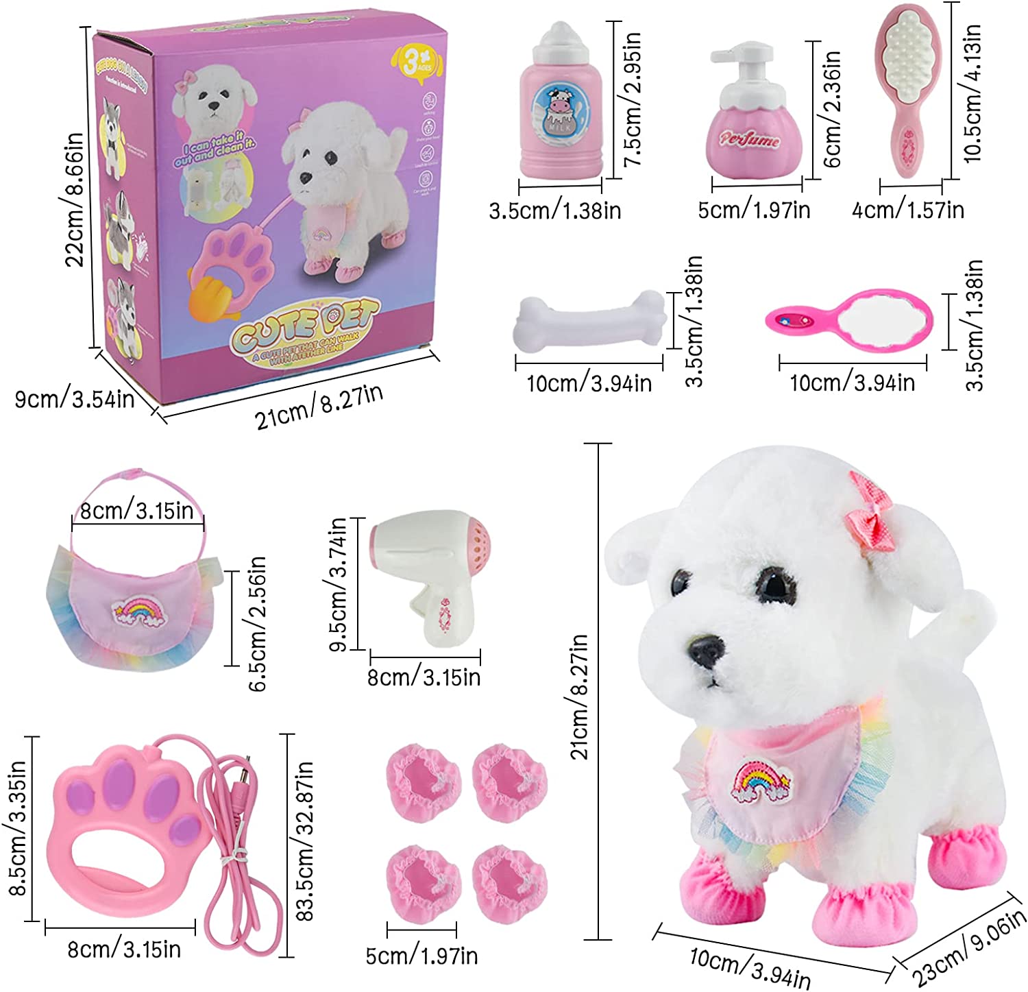 12 acessórios no conjunto: 1 brinquedo para cães, 1 espelho, 1 pente, 1 biberão 1 secador de cabelo, 1 gel de banho, 1 osso para cães, 1 controlador, 4 capas para os pés. Indução e controlo remoto: ao inserir a "trela para cães" na parte de trás do pescoço do cão e pressionar o controlador, pode-se fazer o desejo de passear o cão. Este cachorro latirá enquanto caminha. Controlo: toque na indução da cabeça: toque na cabeça, emitirá um som e moverá a cauda. Detecção de voz: aplaude para que possa latir. Como usar: o brinquedo deve ser usado com 3 pilhas AAA (as pilhas não estão incluídas na embalagem, deve comprar mais). A bateria é montada no abdómen do cachorro. Funciona com 3 pilhas AA - não inclusas. Receba em até 5 dias uteis após a compra.
