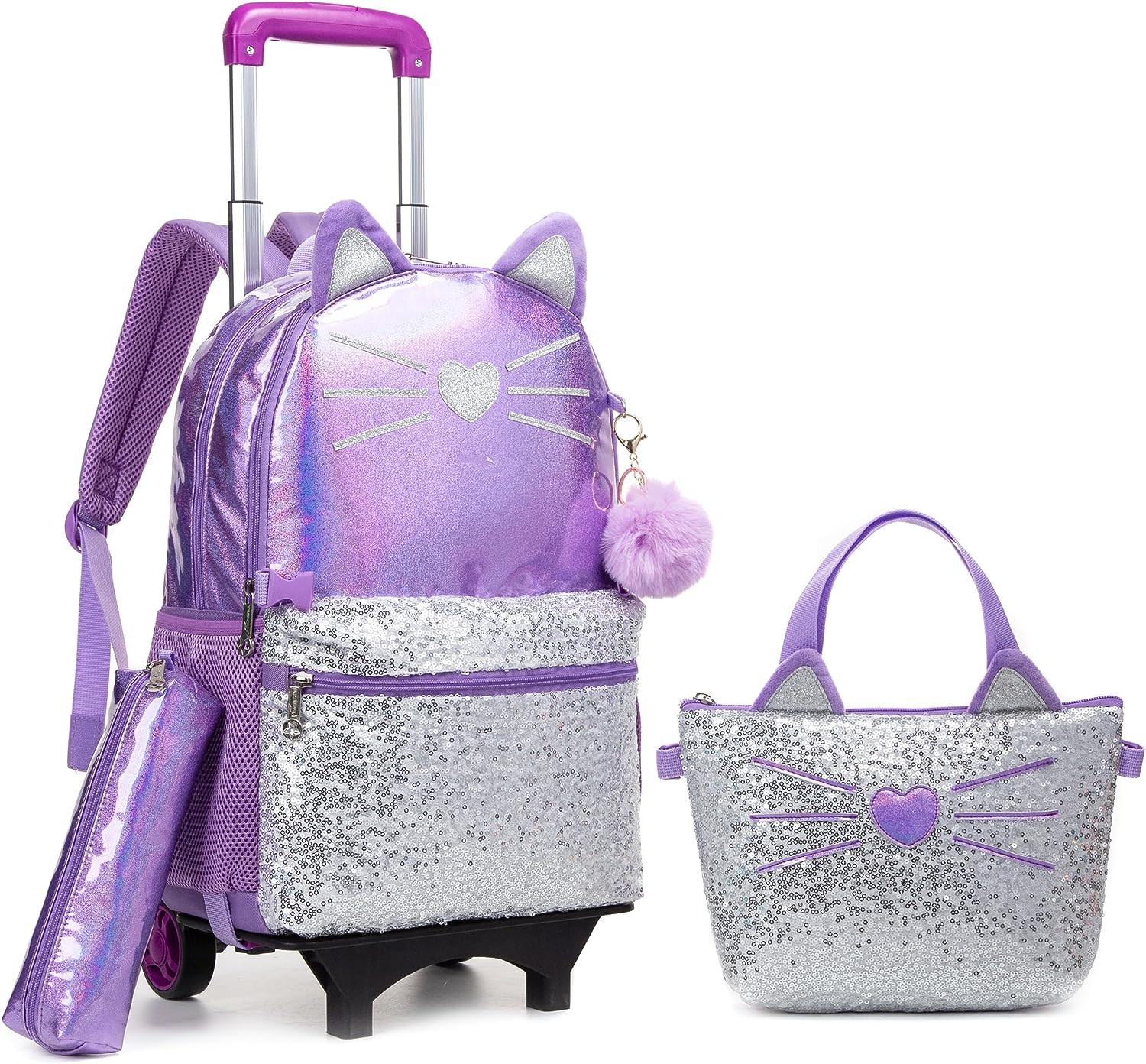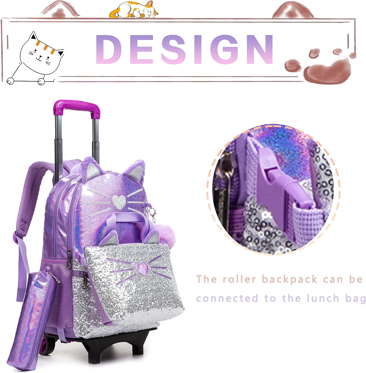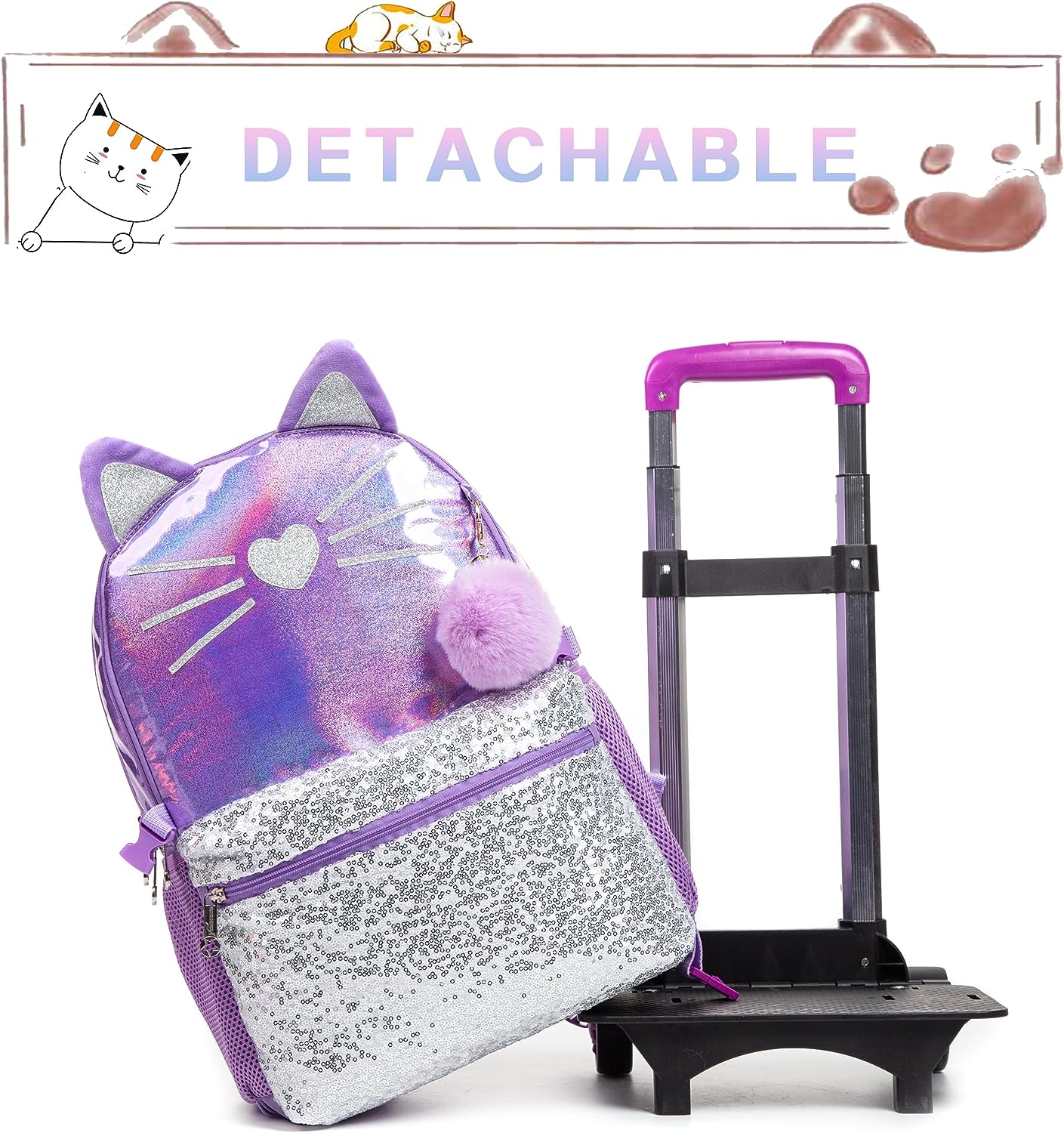 Conjunto Escolar Gatinho Roxo Trolley Removível Brilhante, 3 peças, Mochila Gatinho + Lancheira + Porta Lápis: tamanho grande