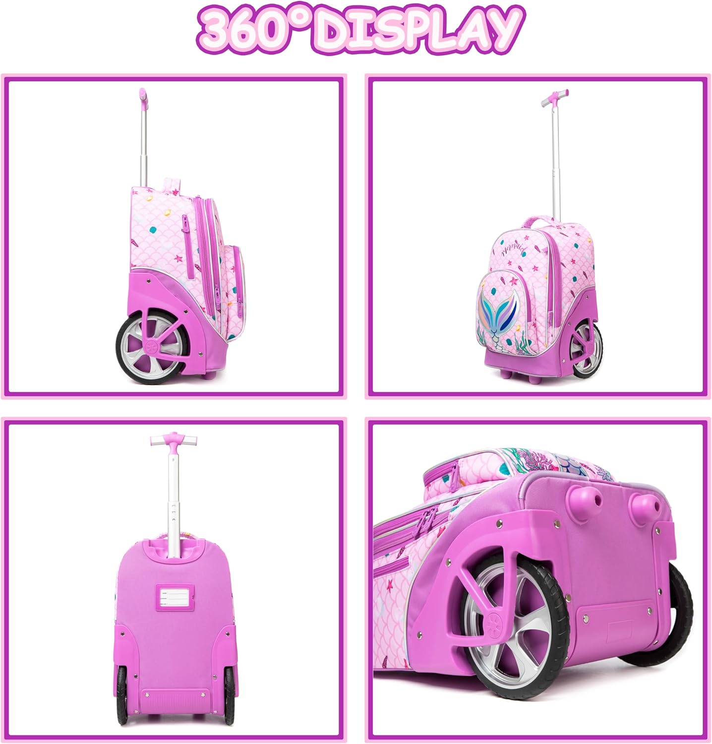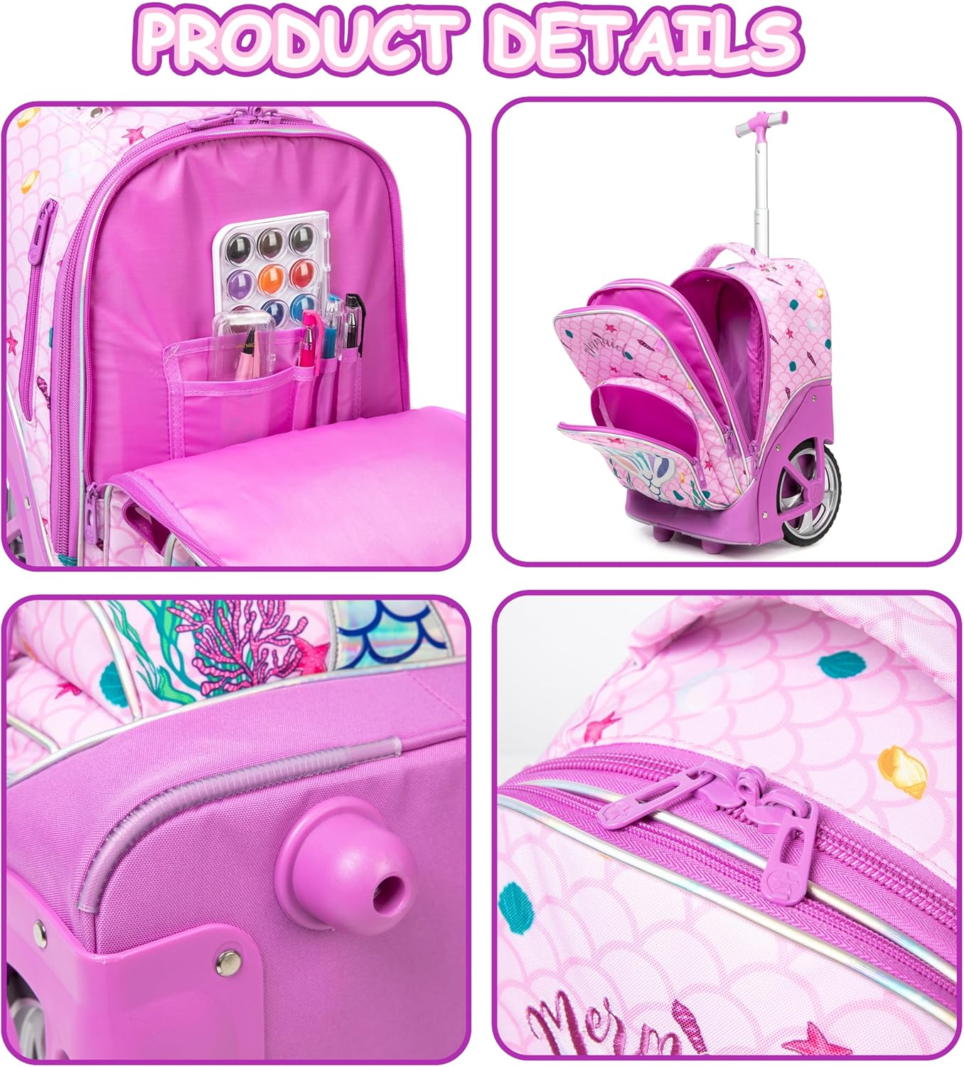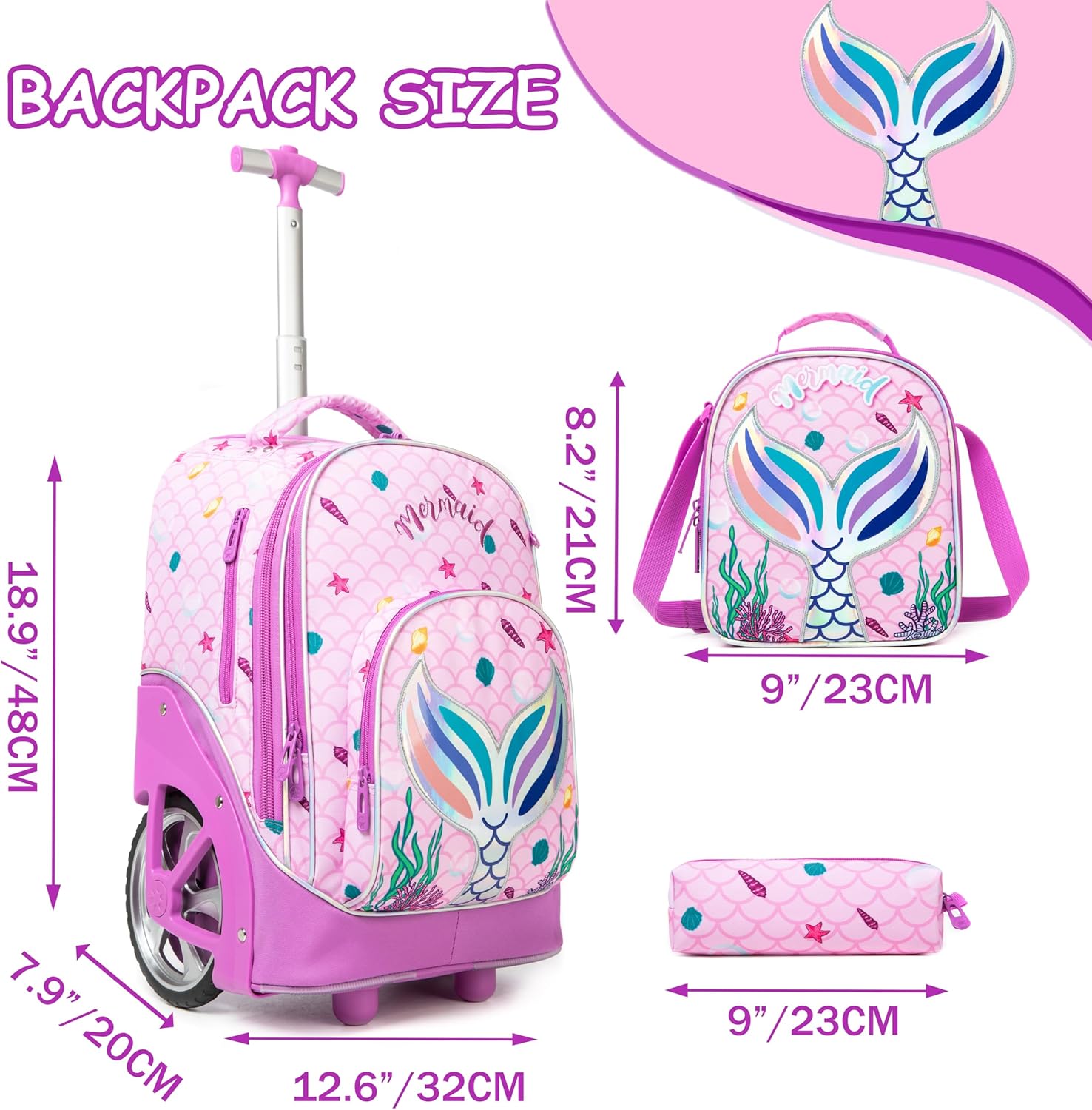 Conjunto Escolar Sereia Rosa: Mochila com Trolley + Lancheira + Porta Lápis: tamanho grande, rodas reforçadas