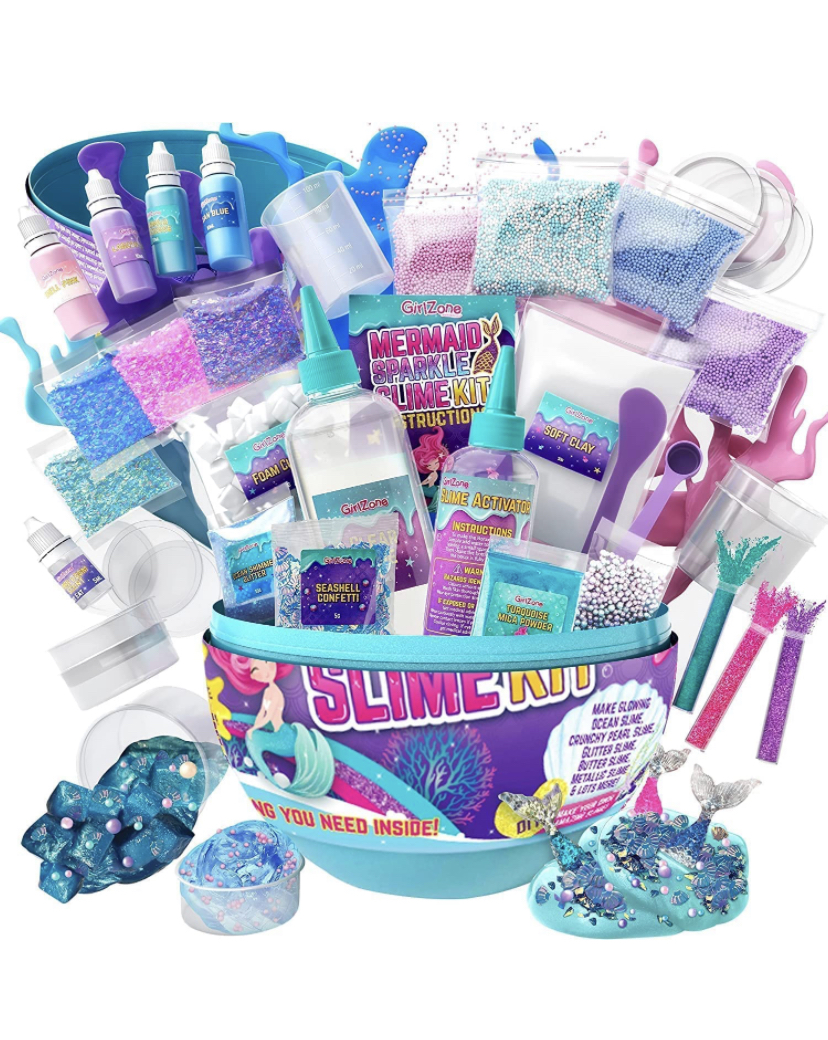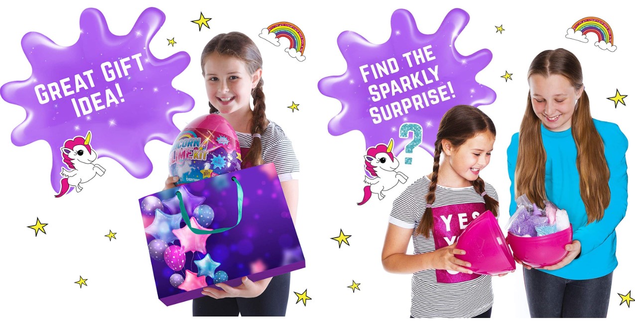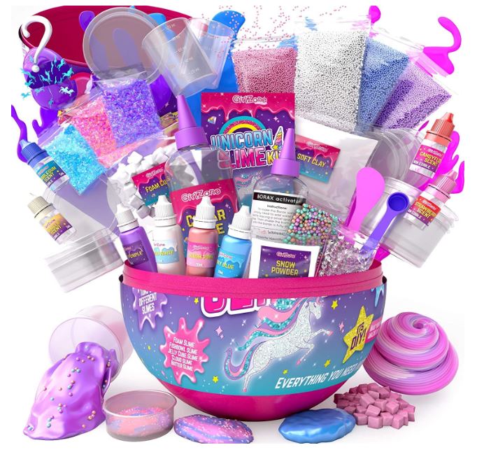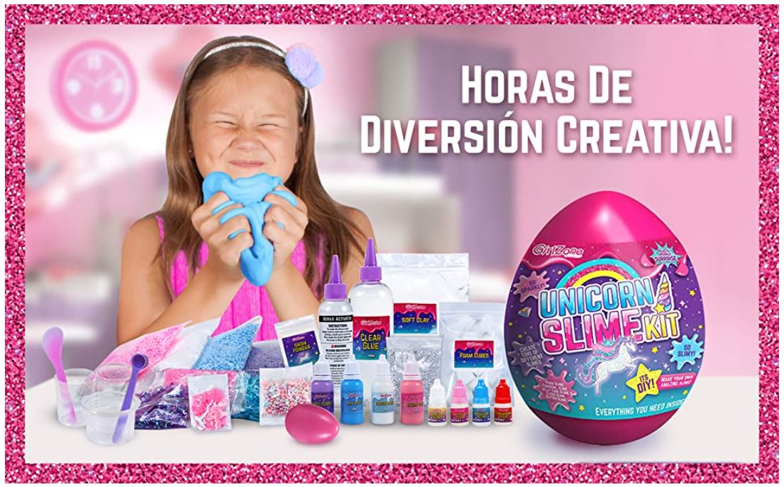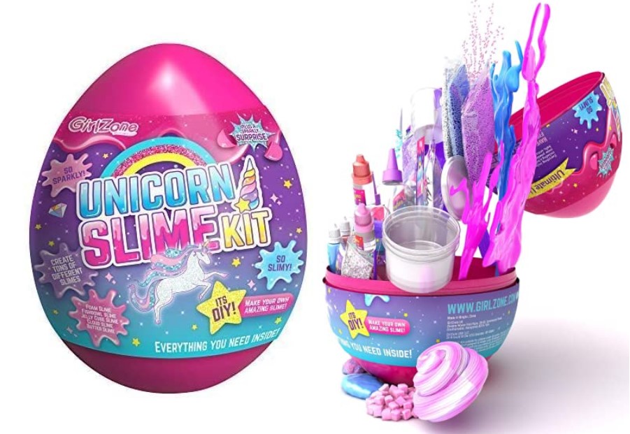 Cola transparente e ativador, Argila macia branca, Cubos e bolas de espuma, Glitter em escamas, pérolas e contas, pó de neve, 4 tintas coloridas unicórnio, 4 aromas unicórnio/mermaid/candy, 1 mini ovo surpresa - que cor será? Sortidos entre rosa, amarelo e turqueza.  Recipientes e instrumentos para misturar. Idade recomendada: +4 anos.