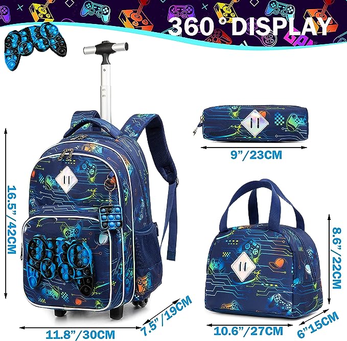 Grande capacidade: dimensões da mochila: 42x19x30cm - lancheira 22 x 27 x 15 cm, estojo para lápis: 23cm. Pode conter a maioria dos artigos de papelaria necessários para a escola: livros em tamanho A4, cadernos, garrafas, carteira, guarda-chuvas, estojo de lápis e outros artigos de papelaria. Ideal para alunos de escolas primárias e secundárias. Conjunto 3 em 1: o conjunto de mochila vem com mochila trolley + lancheira + estojo para lápis e um Pop iT de prenda. Ideal para alunos do ensino básico e secundário. Ajude os seus filhos a reduzir o peso e a contribuir para o crescimento saudável das crianças. Materiais premium: rodas silenciosas, alça em liga de alumínio muito leve. Várias ocasiões: não é apenas uma mochila escolar, pode ser usada como uma mala de viagem, compras, desportos e caminhadas. Ideal para atividades internas e externas. Uma mochila para vários usos. A sua escolha perfeita. Tenha em consideração que o trolley não é removível. Receba em até 05 dias uteis após a compra.
