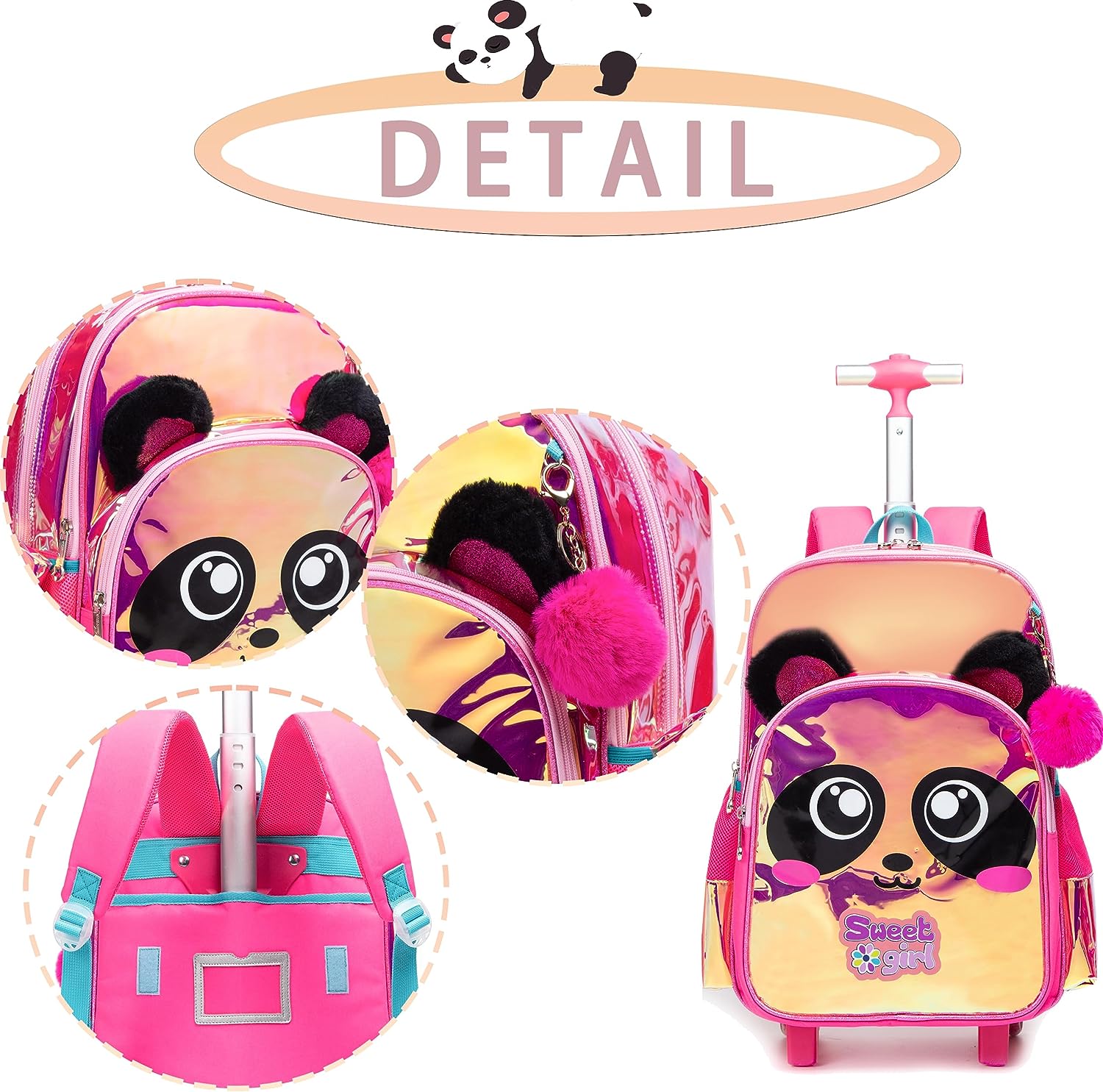 Conjunto Trolley Escolar Panda colorido 3 peças, Kit Escolar Panda Mochila + Lancheira + Porta Lápis: tamanho grande, com troley