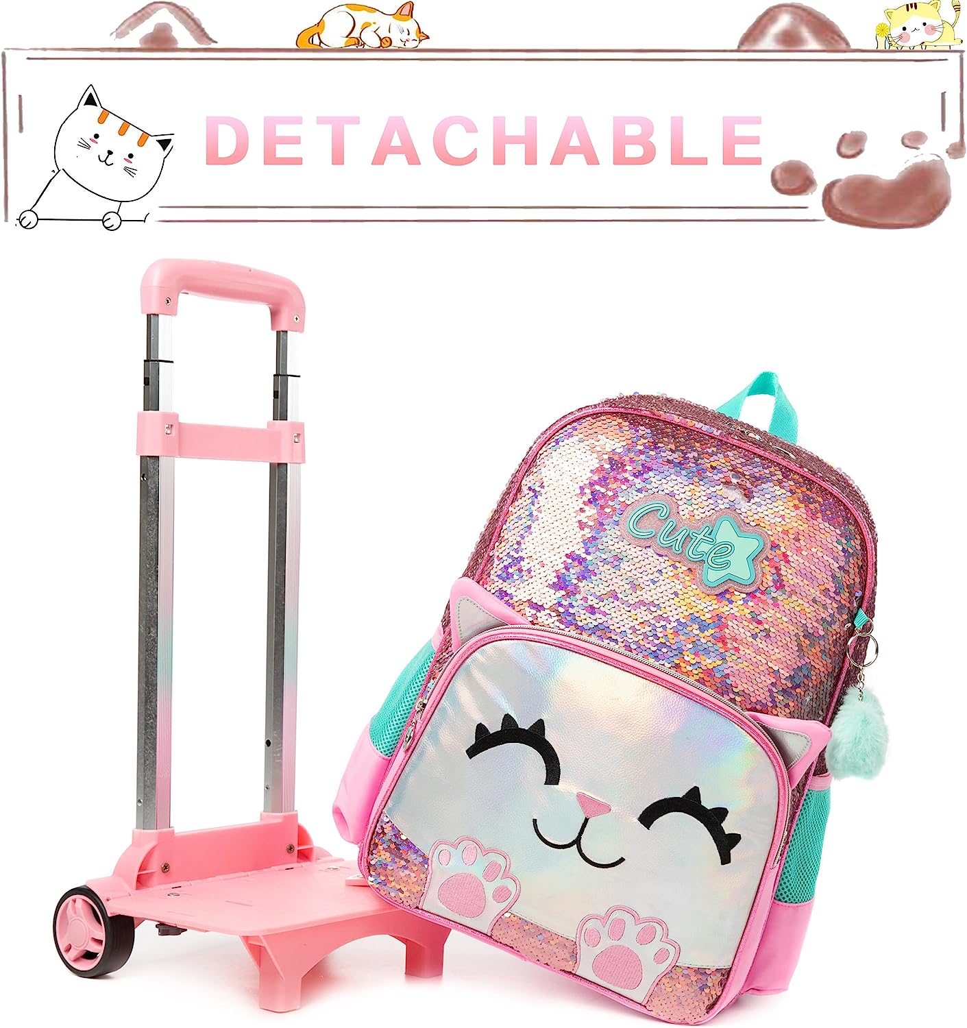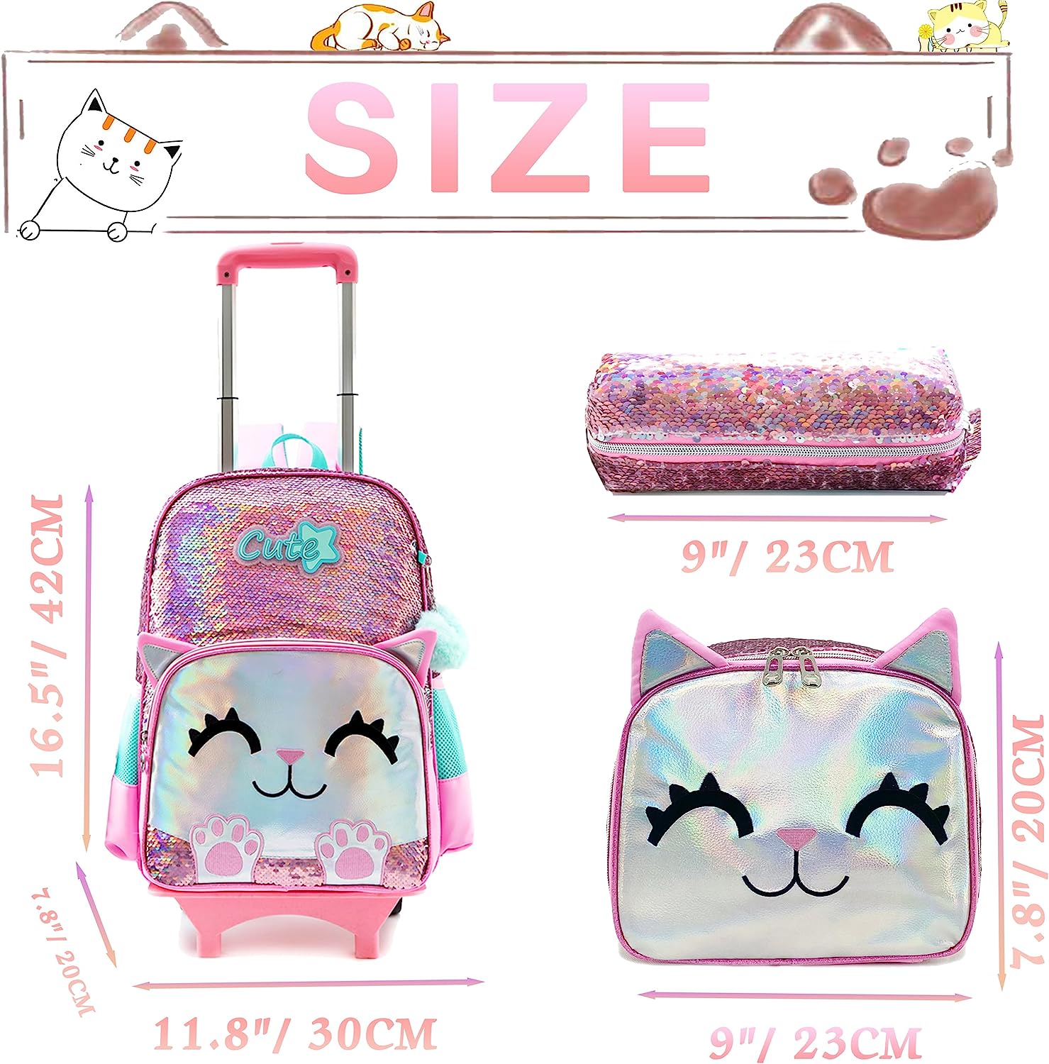 Kit 3 peças Mochila Gatinho Rosa + Lancheira + Porta Lápis: tamanho grande, com lantejoulas, com trolley
