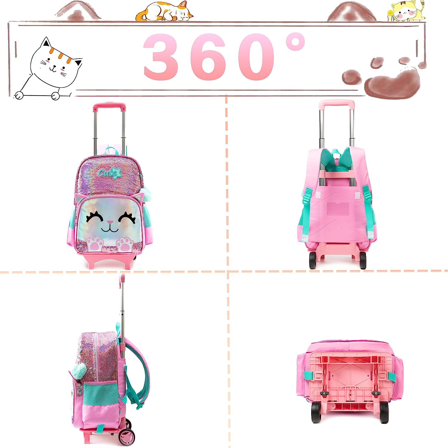Mochila infantil de grande capacidade: a mochila com rodas para crianças contém 1 bolso principal grande, 1 bolso frontal com fecho de correr, 2 bolsos de armazenamento de malha laterais. Trolley em alumínio, muito leve e fácil de carregar.