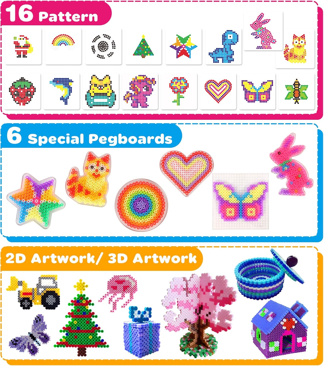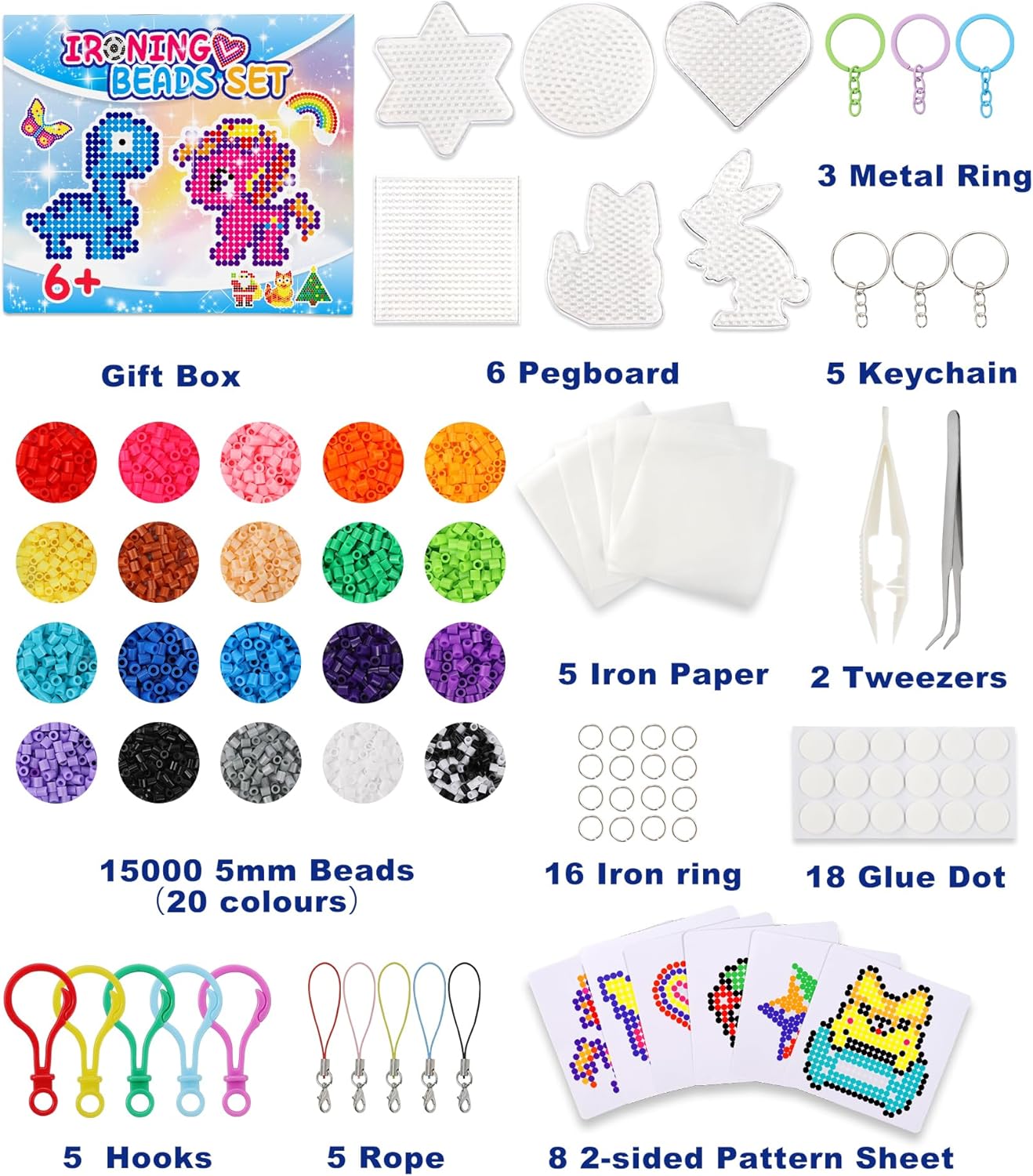 O Conjunto de Contas oferece 16 placas de moldes e 6 de missangas de passar de ferro, 5 papéis de passar roupa. Você pode colocar o padrão que gostar embaixo da breadboard e começar a criar suas criações de artesanato 2D e 3D. Além dos 16 padrões, você também pode pesquisar online por padrões, personagens ou emojis que gostaria de criar, assim tens infinitas possibilidades.