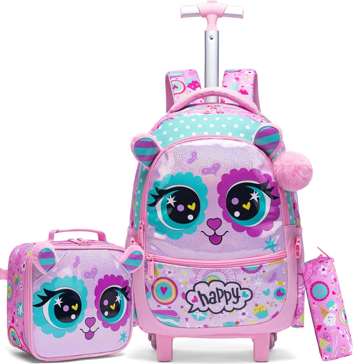 Kit Escolar Gatinha Rosa Mochila com Trolley + Lancheira + Porta Lápis: tamanho grande