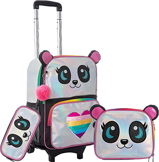Kit Escolar Panda Arco-íris, Mochila Panda com Trolley removível + Lancheira + Porta Lápis: tamanho grande