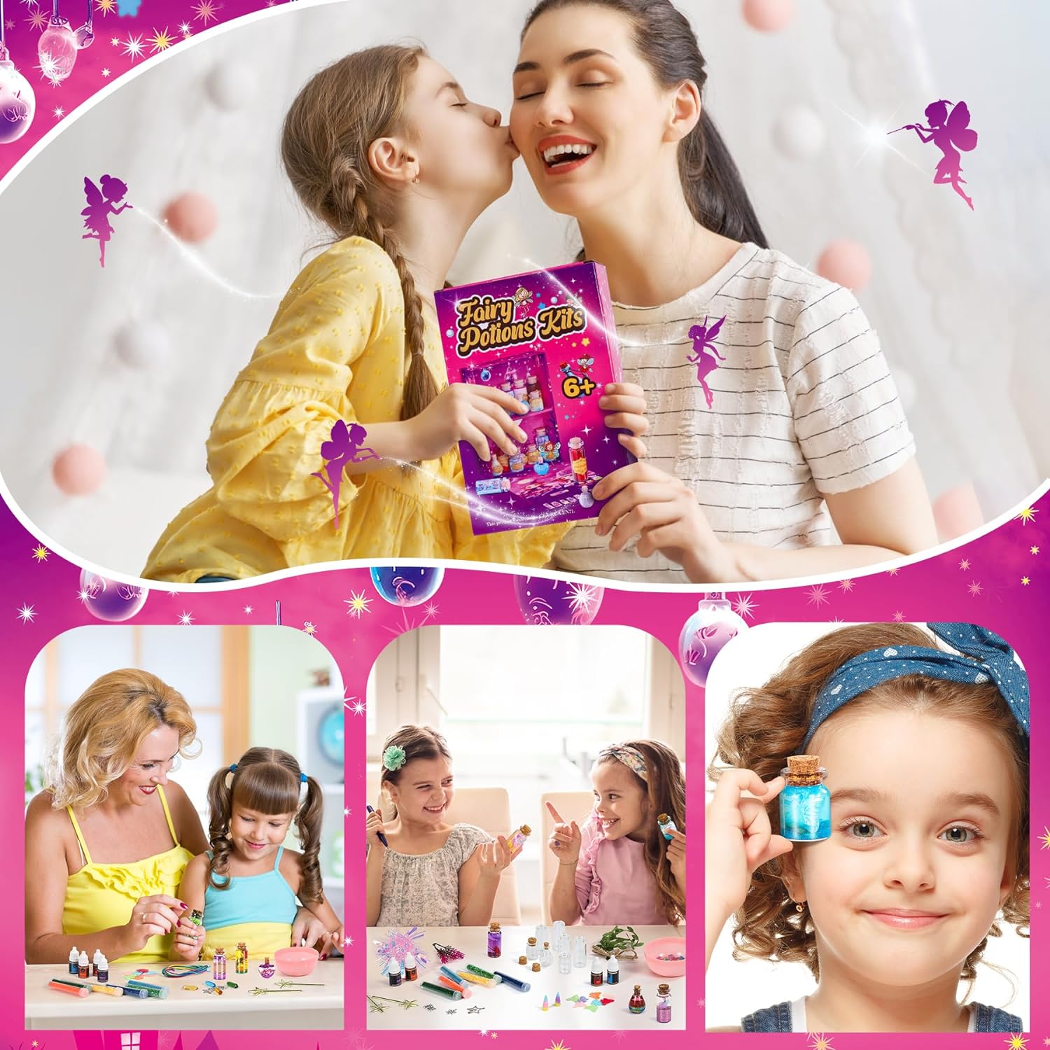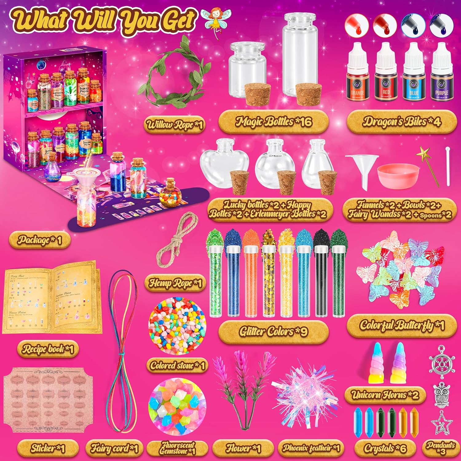 Kit para fazer poções mágicas: mergulhe num mundo mágico com este kit de poções mágicas de bricolage! Este conjunto estimula a imaginação com 22 garrafas, asas, autocolantes e elementos mágicos, como pedras coloridas, sumo de genciana e purpurina de fadas. Com ferramentas como uma tigela e um funil, as crianças podem criar facilmente as suas próprias poções. Liberte a sua criatividade e maravilhe-se com as maravilhas deste kit incrível!