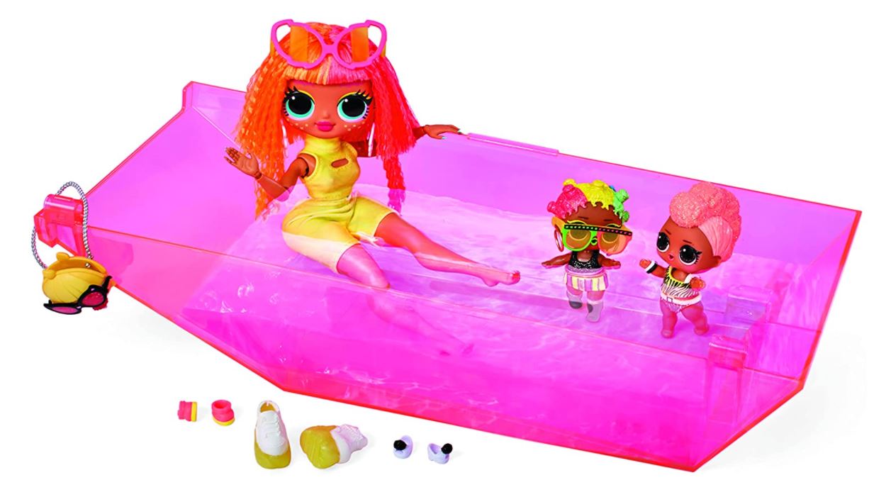 O veículo Party Cruiser é 3 em 1 é muito mais que uma viatura! Com visual futurista e acabamento luxuoso nas cores rosa e dourado acomoda bonecas L.O.L. de todos os tamanhos. Com capota removível, tem o volante em neon e cinto de segurança, levando confortavelmente até quatro bonecas para festas incríveis. A traseira do carro é um detalhe à parte, com a inscrição “Shuffle-matic” e a placa “I❤️2DNC”.