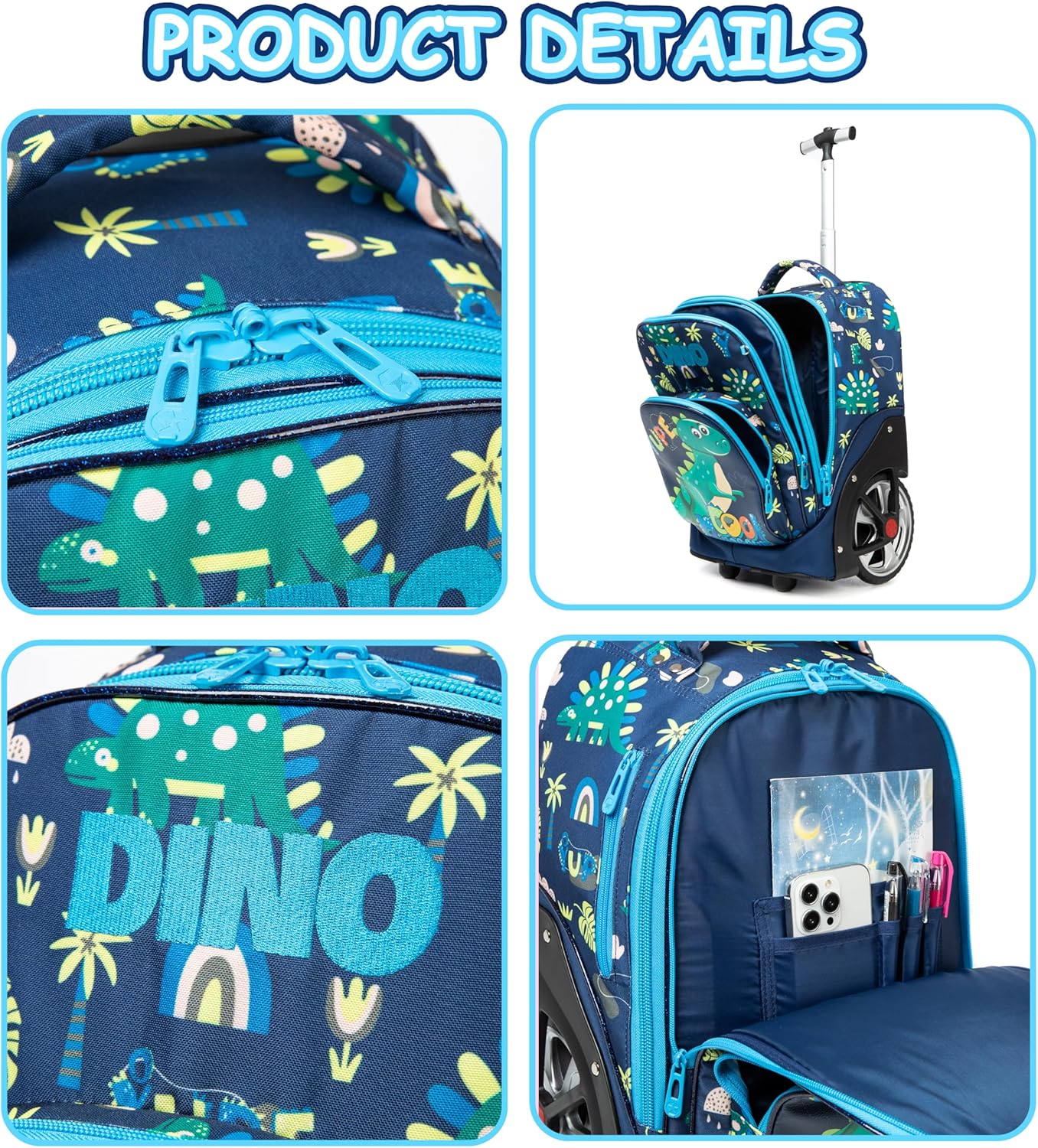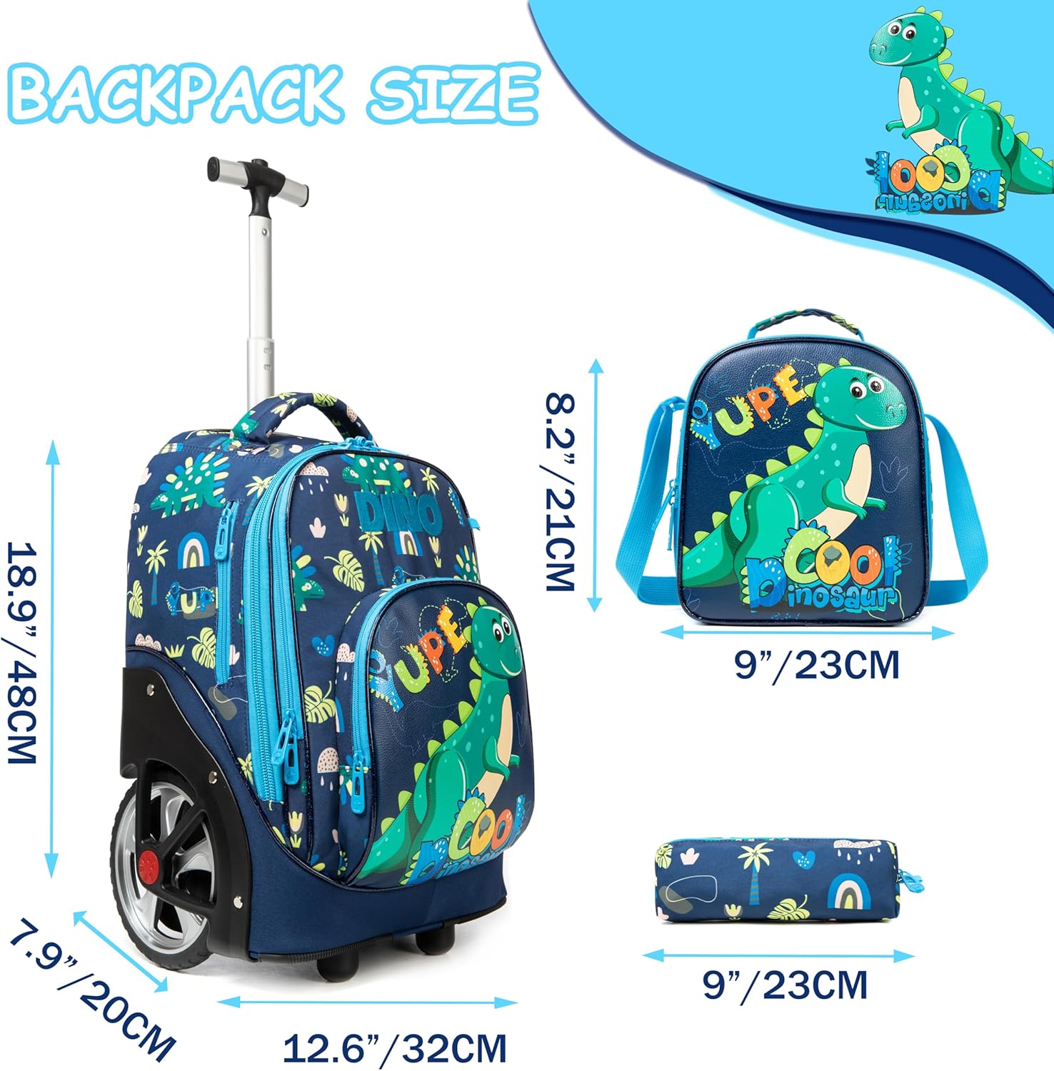 Dimensões da mochila: 40x18x30cm - lancheira 23 x 21 x 11 cm, estojo para lápis: 20cm. Materiais premium: rodas reforçadas e silenciosas, alça em liga de alumínio muito leve. Ajude os seus filhos a reduzir o peso e a contribuir para o crescimento saudável das crianças.