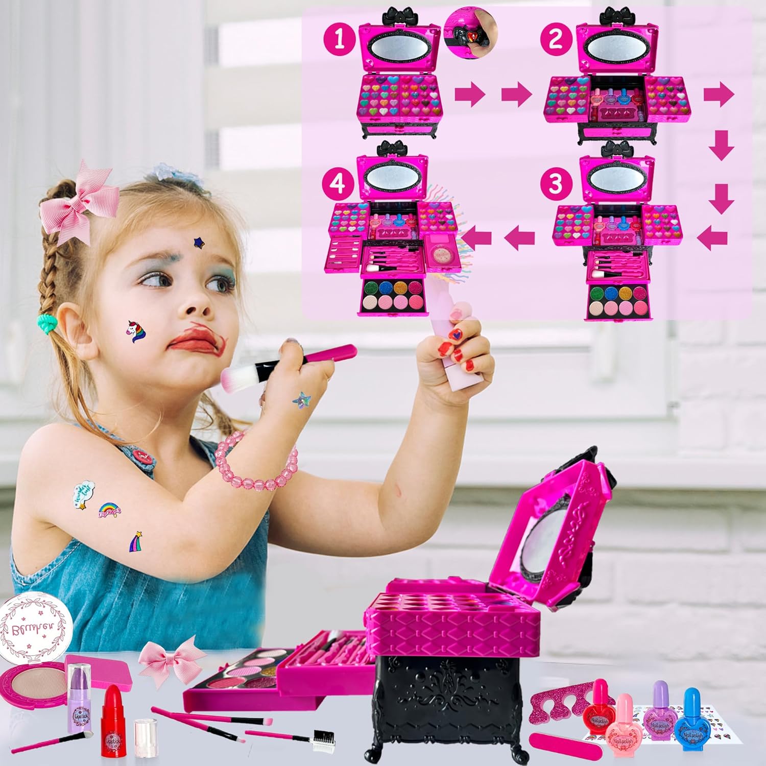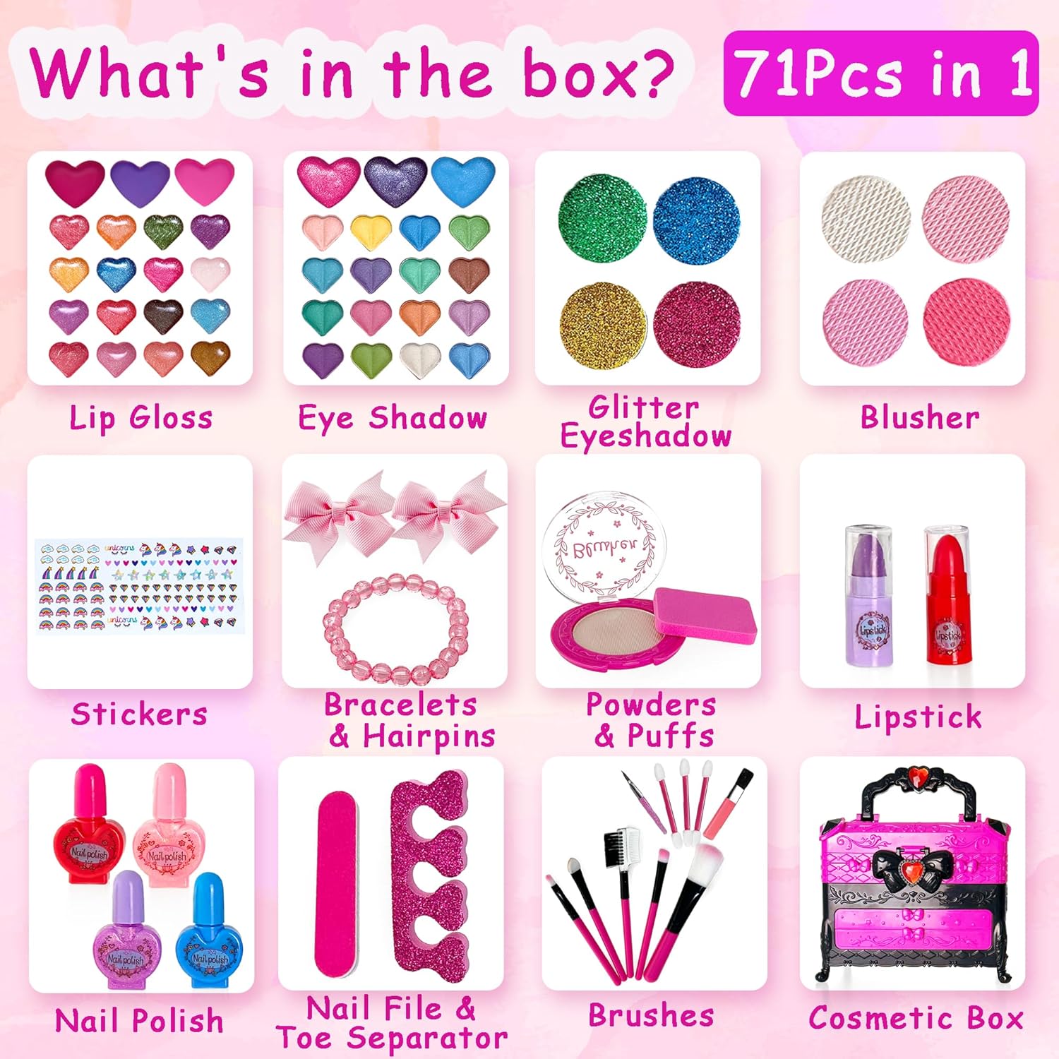 Lindo conjunto de maquilhagem infantil, incluindo 19 sombras de olhos, 19 brilhos de lábios, 4 pós brilhantes, 4 blushs, 2 batons, 1 puff, 4 frascos de verniz de unhas, 1 separador de dedos dos pés, 5 pincéis Maquilhagem, 3 Pincéis de sombra de olhos, 1 pincel de brilho labial, 1 pincel de blush, 1 cartela de adesivos, 2 ganchos de cabelo com laço, 1 pulseira de corda e 1 estojo de maquilhagem.