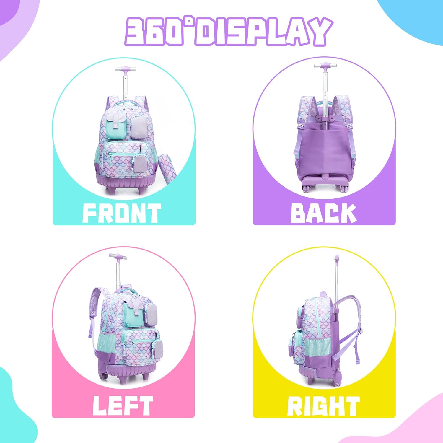 Conjunto Escolar Sereia Roxa: Mochila com Trolley + Lancheira + Porta Lápis: tamanho grande, rodas reforçadas, envio imediato