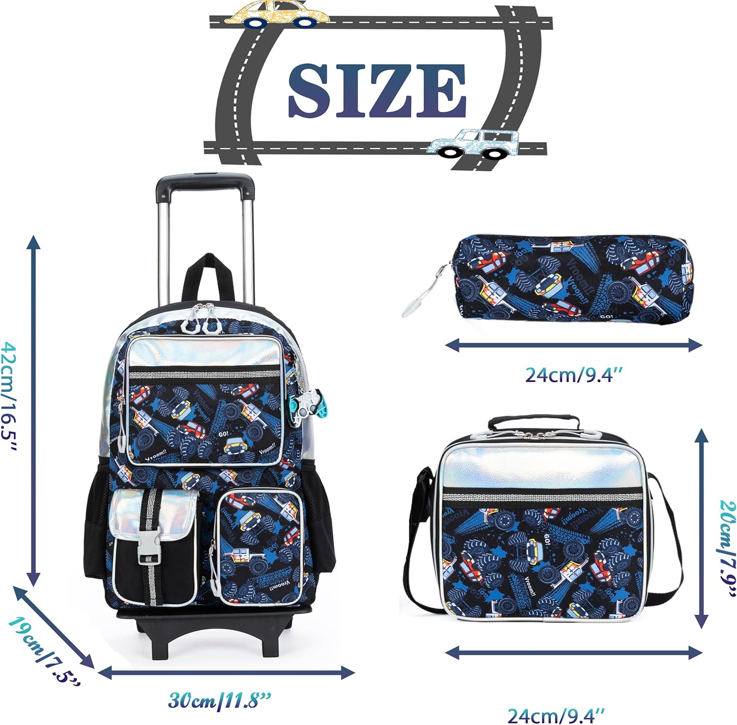 Kit Escolar Carros Mochila com Trolley removível + Lancheira + Porta Lápis: tamanho grande