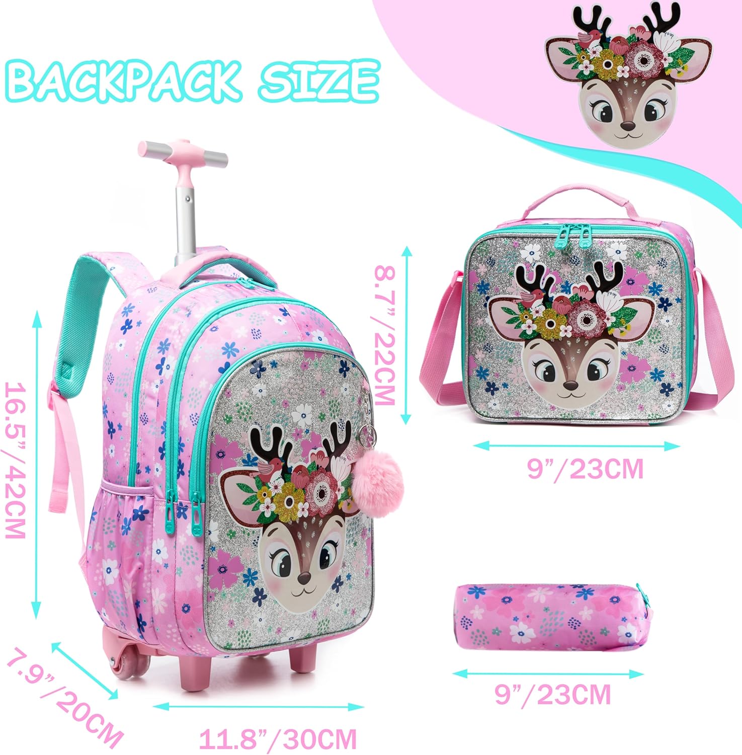 Kit Escolar Cervo Flores: Mochila com Trolley + Lancheira + Porta Lápis: tamanho grande