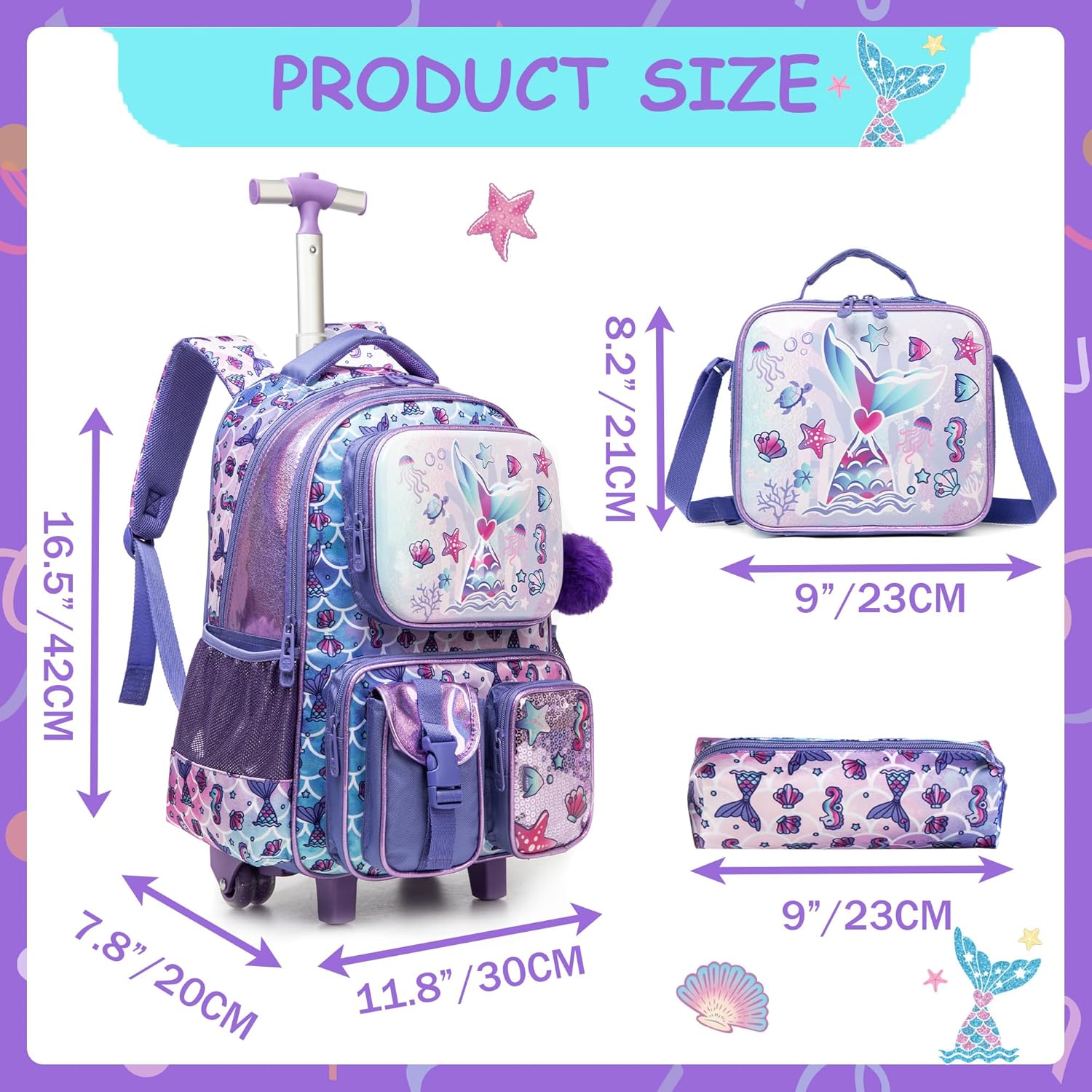 Kit Escolar Sereia Roxa - Fundo do Mar: Mochila com Trolley + Lancheira + Porta Lápis: tamanho grande