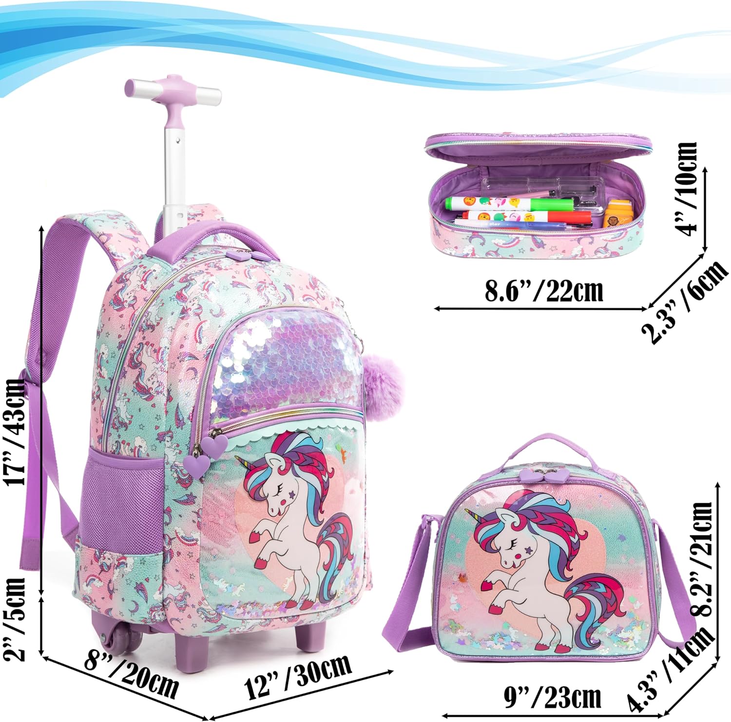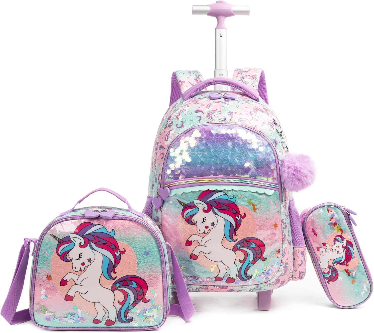 Kit Escolar Unicórnio tranças: Mochila com Trolley + Lancheira + Porta Lápis: tamanho grande