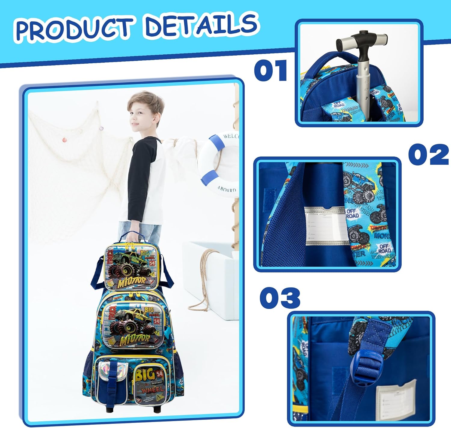 Design alegre, espaçoso, seus 8 compartimentos permitem um bom armazenamento, sendo possível usar na escola, férias, passeios e viagens. Rodas de baixo ruído e que facilitam o transporte. Haste em alumínio, leve e de alta resistência com 2 configurações de comprimento.