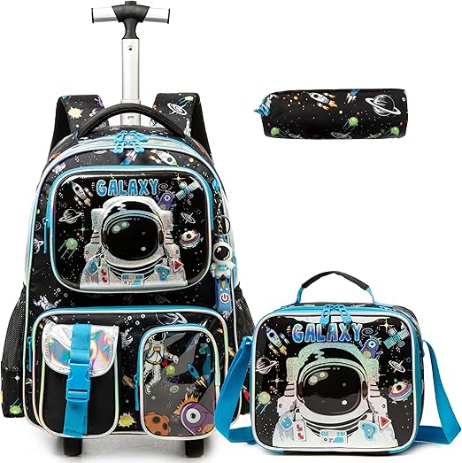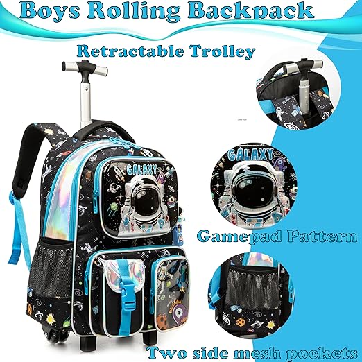 Mochila com design de astronauta feita de tecido Oxford de alta qualidade e durável, resistente à água, para que possa proteger os seus pertences como o portátil da chuva. O carrinho é feito de liga de alumínio resistente para transportar objetos pesados.